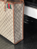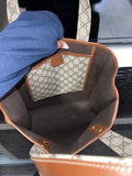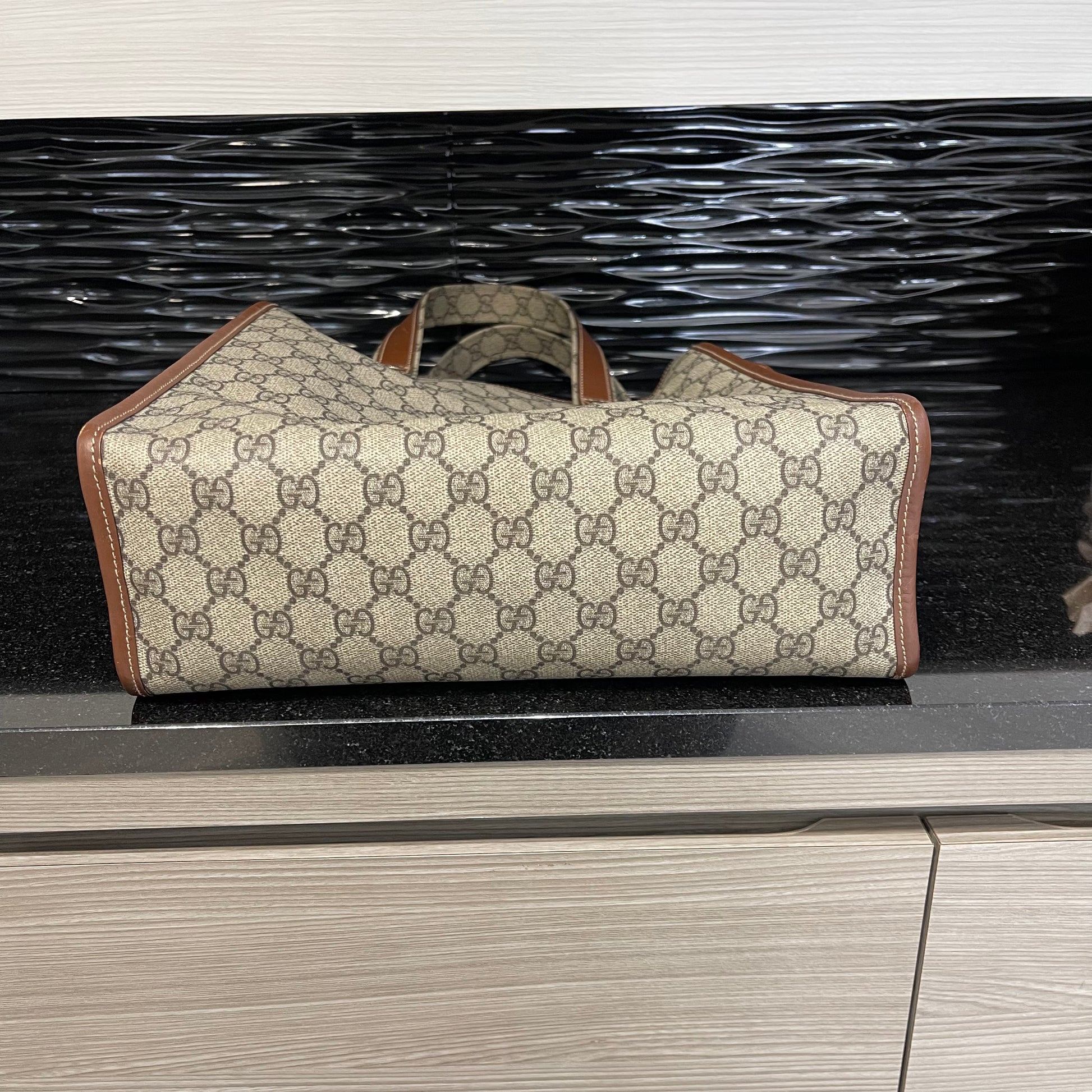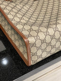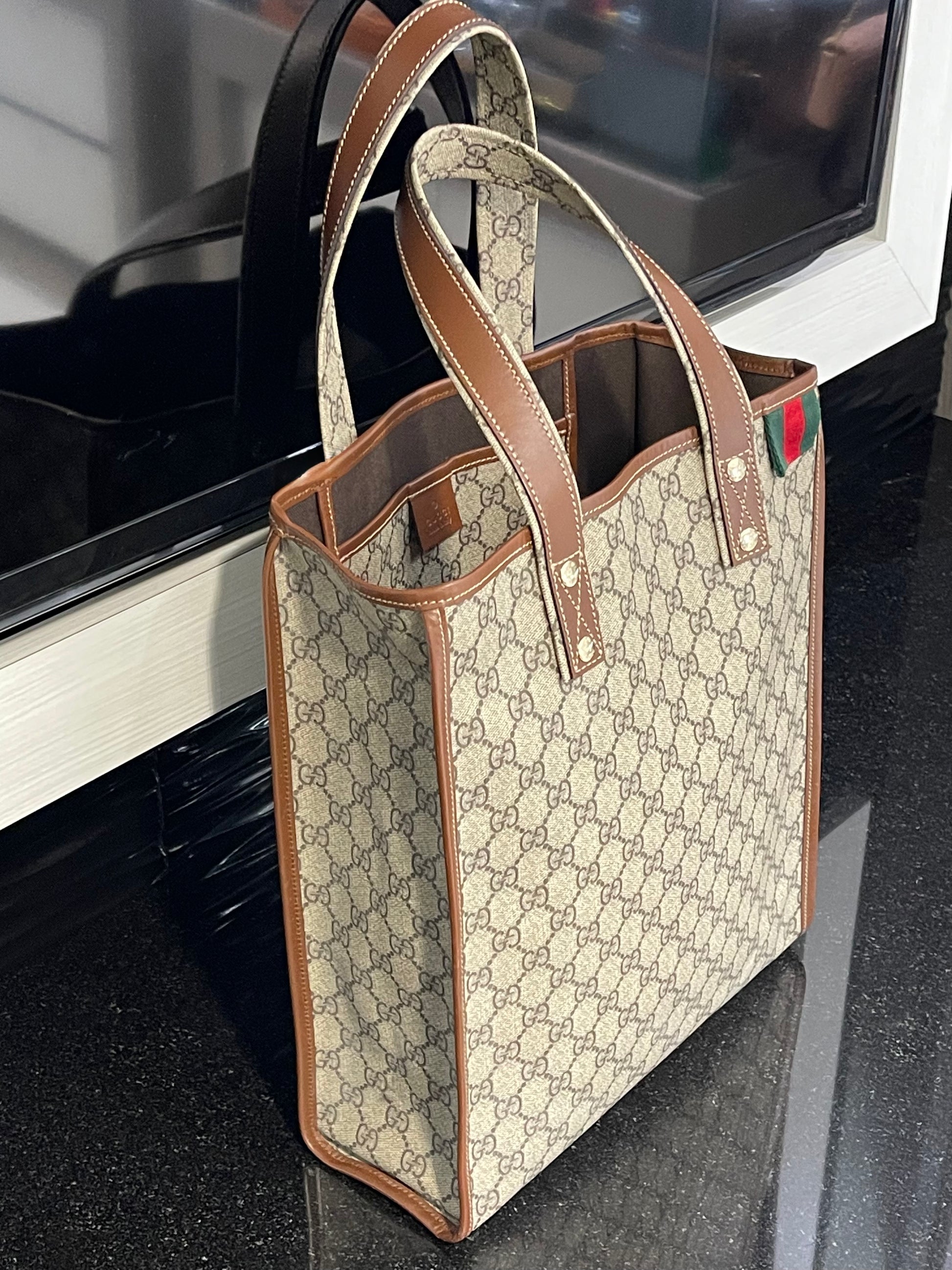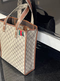 This authentic Gucci GG Supreme Web Tote Bag perfectly balances timeless elegance with everyday functionality. Crafted from Gucci’s signature GG Supreme coated canvas with smooth leather trim, this tote features a structured upright silhouette and a refined stripe accent that adds a touch of classic sophistication.