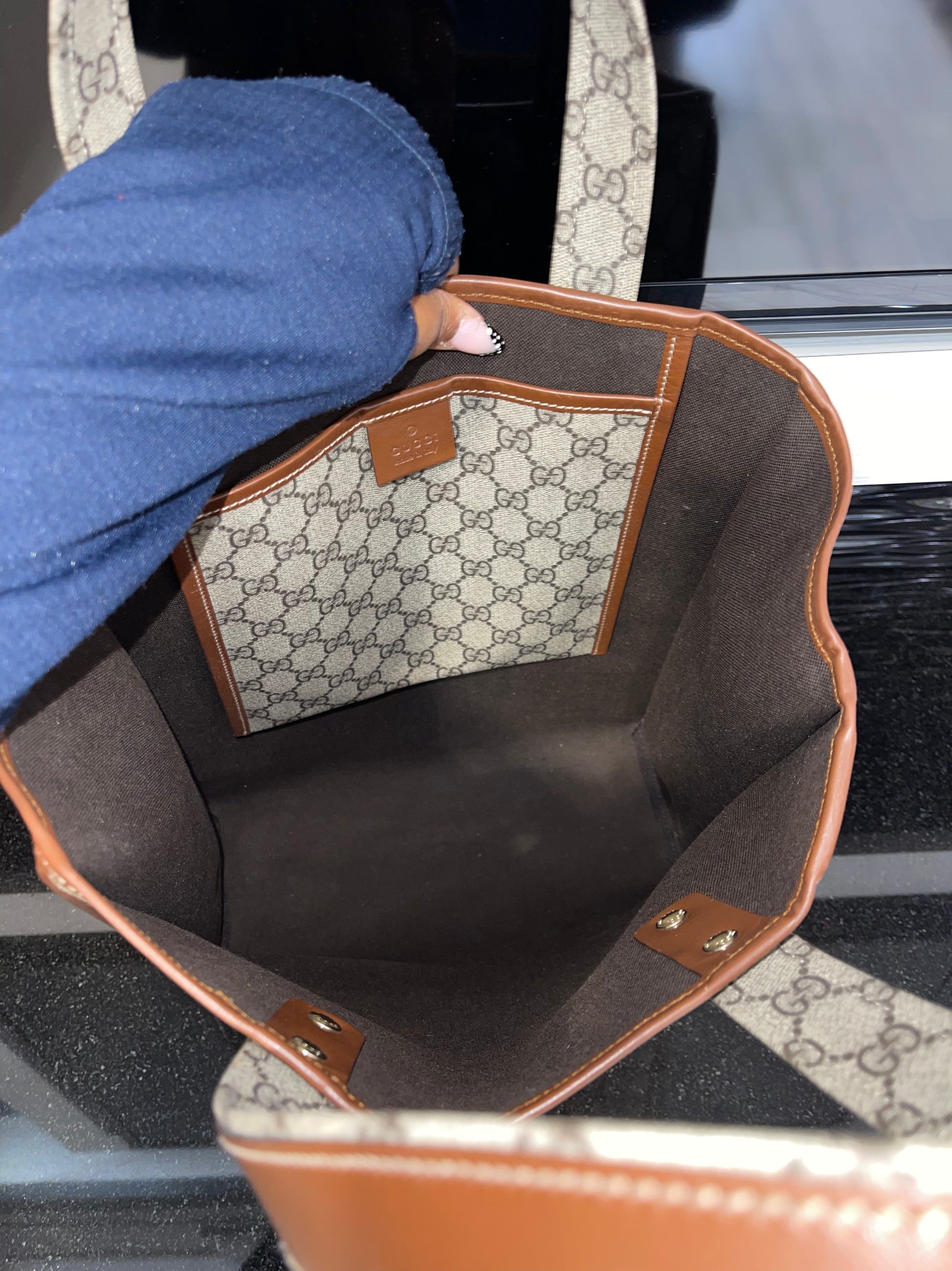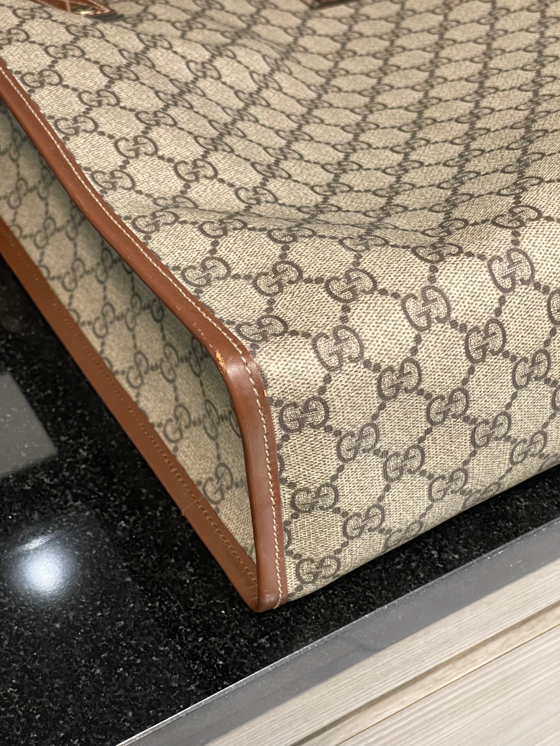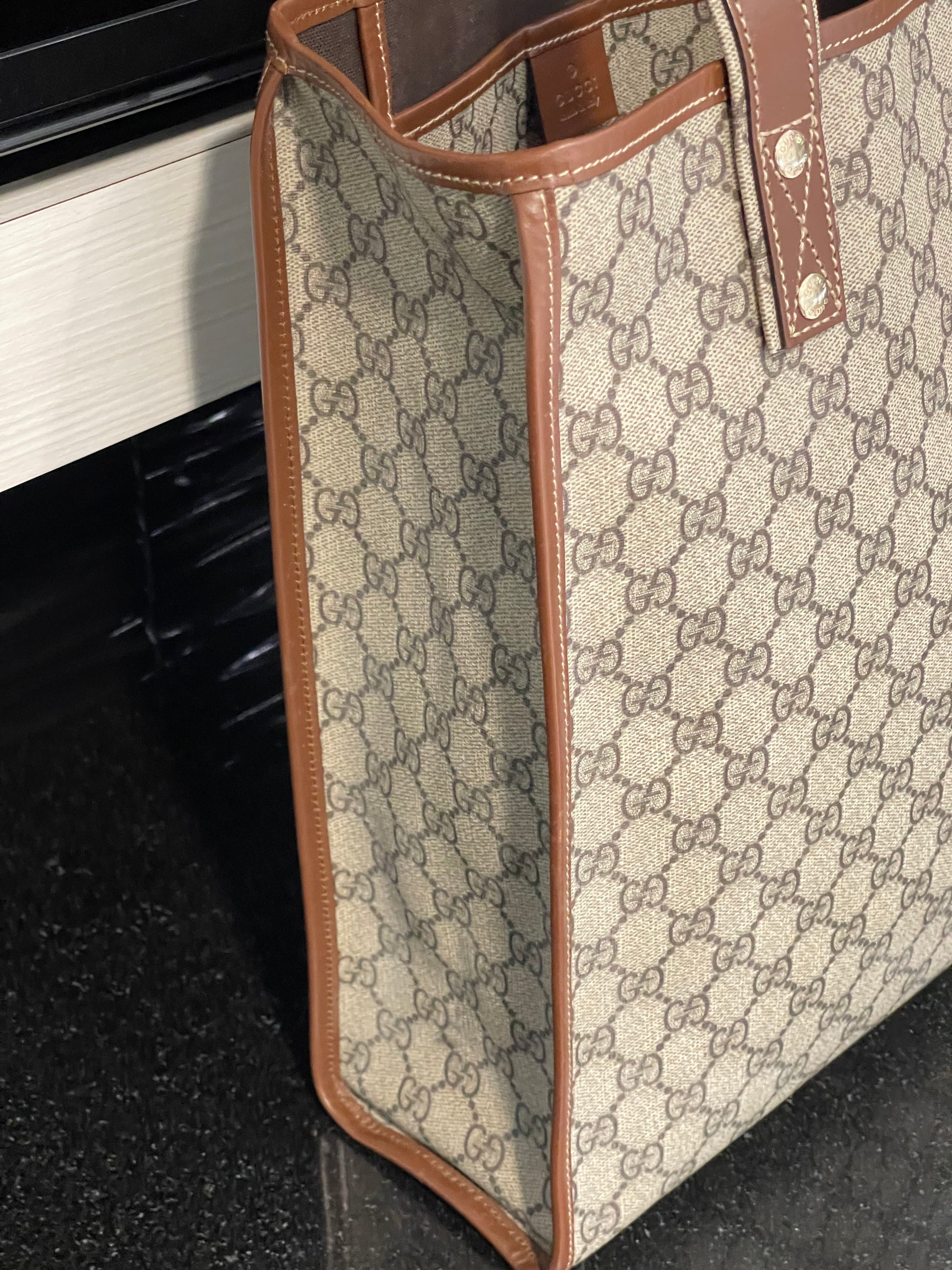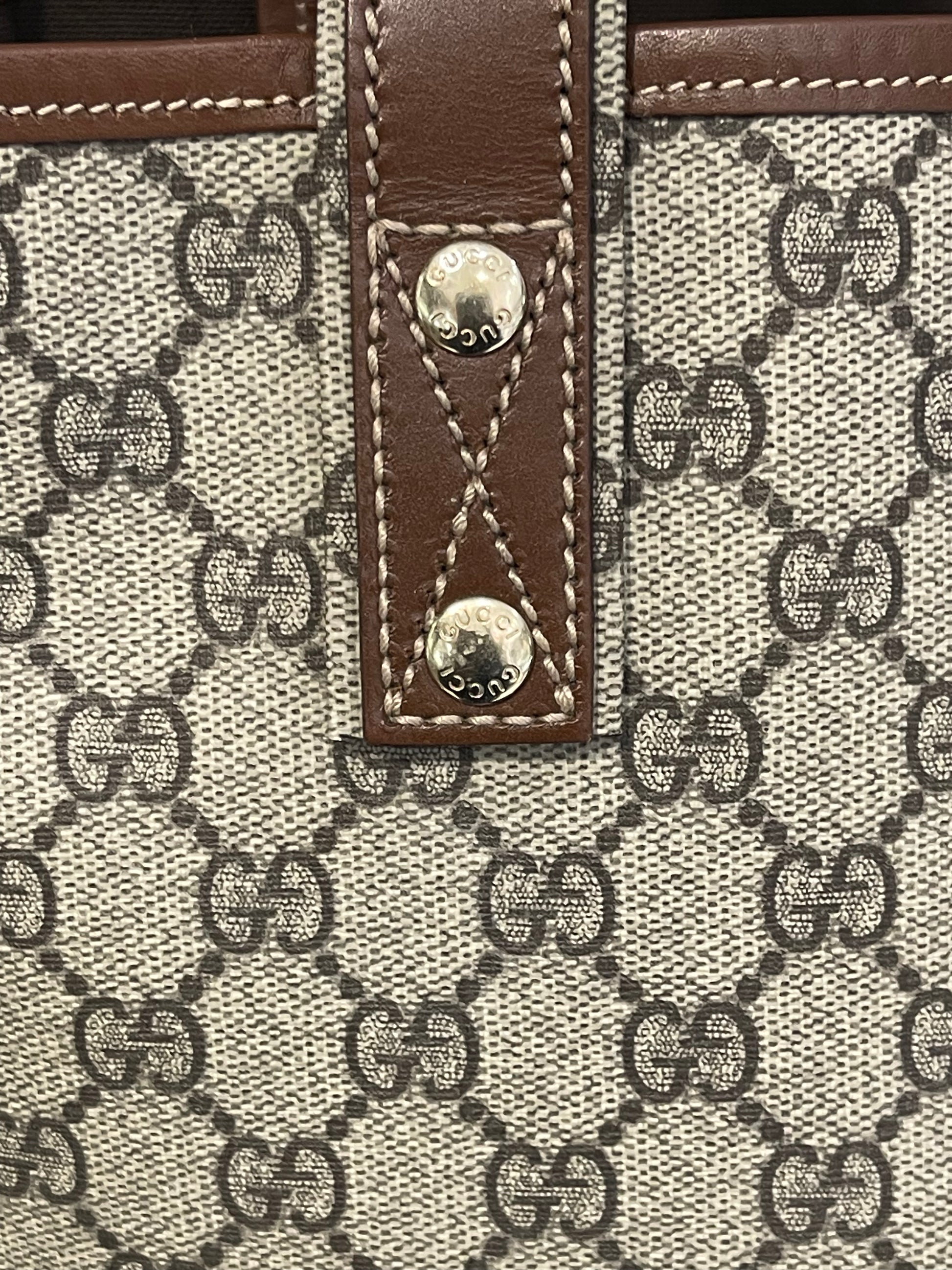 Elevate your everyday with this Gucci GG Supreme Tote, a sophisticated essential designed for the modern individual. Its spacious interior makes it perfect for daily essentials — from work documents to weekend outings — while its comfortable flat leather handles ensure ease of carry. A versatile and stylish investment, this tote seamlessly transitions from casual to polished settings, embodying the effortless luxury synonymous with Gucci.
