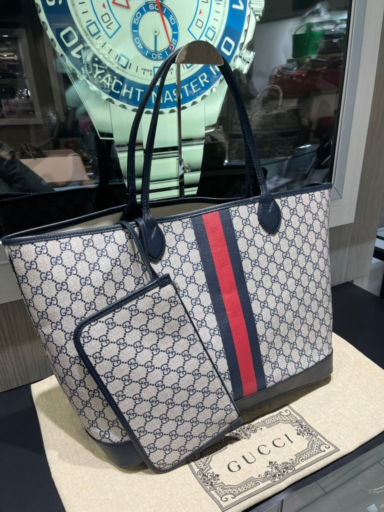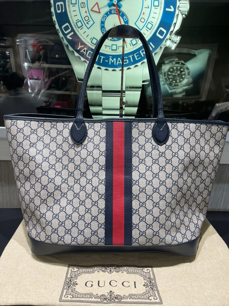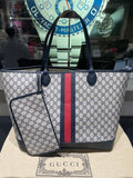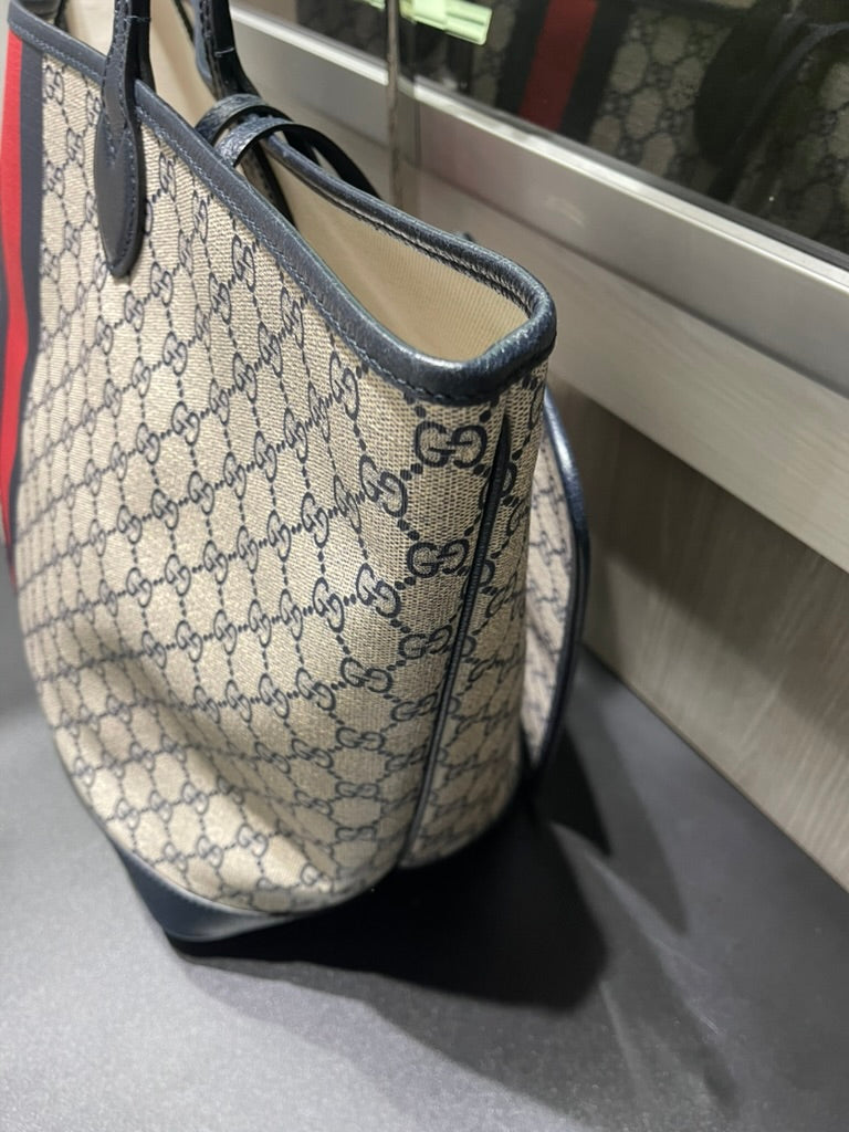 Pre-owned Gucci Navy GG Supreme Tote with Red/Navy Web & Matching Wristlet