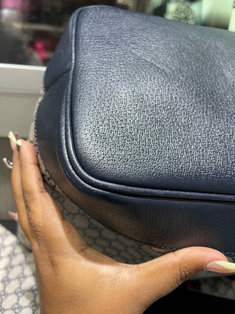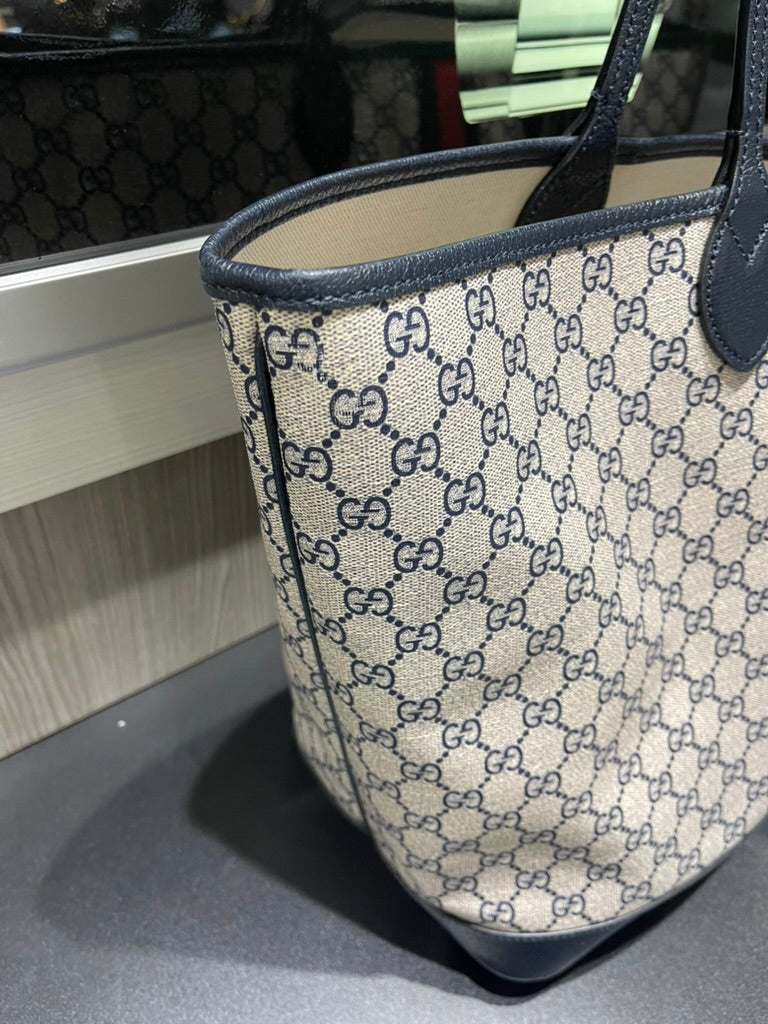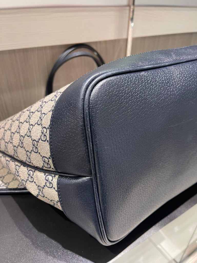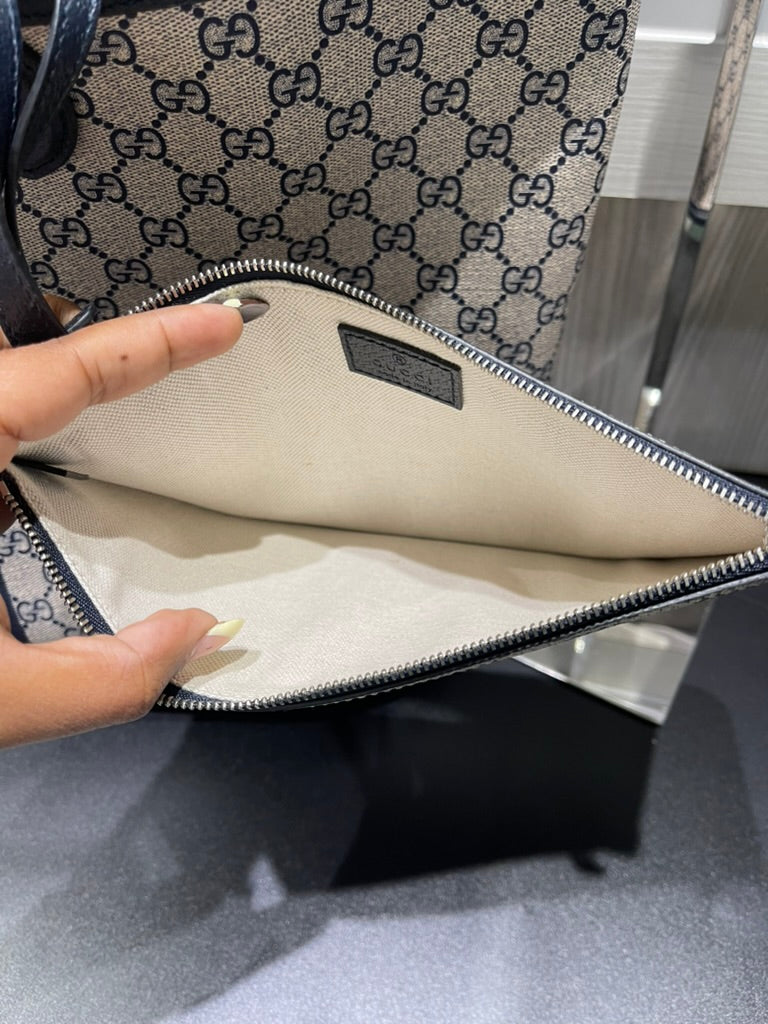 This pre-owned Gucci Navy GG Supreme Tote with matching wristlet is in very good condition, showing light signs of prior use. The tote has a naturally relaxed structure, minor scratches/scuffs along the interior bottom, a small mark on the interior fabric, and light scuffing on the bottom corners. The detachable wristlet remains in excellent condition, making this set both stylish and functional.