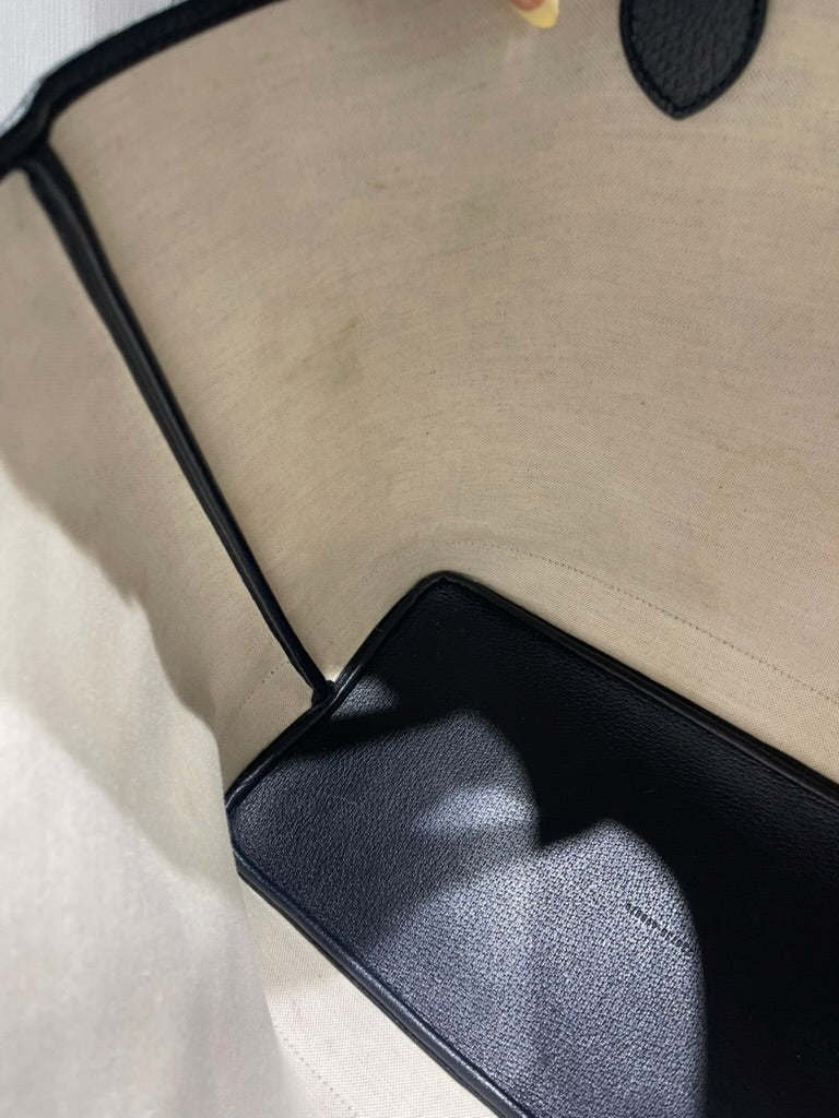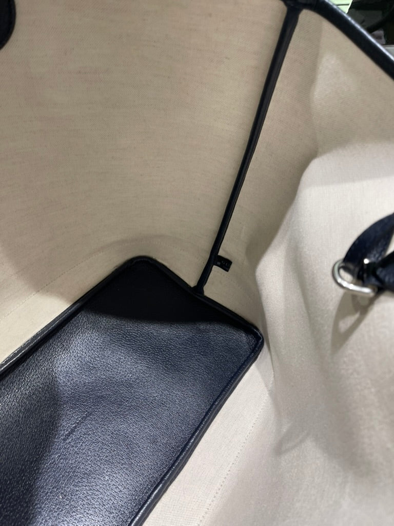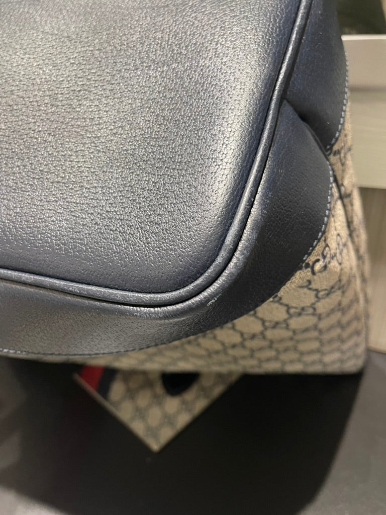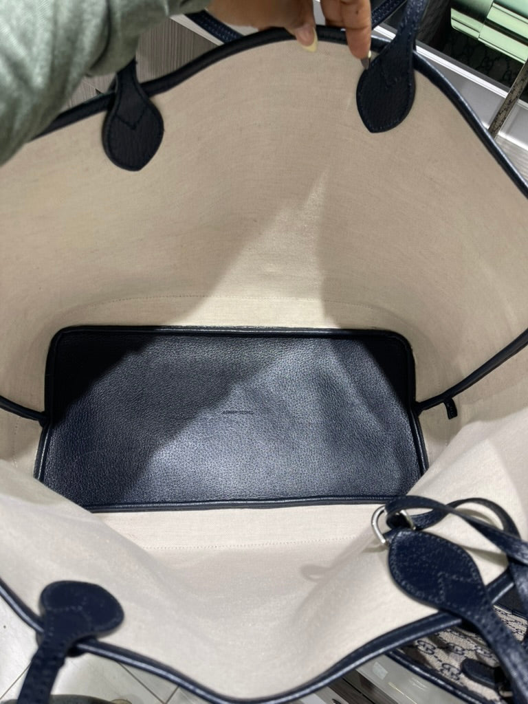 This pre-owned Gucci Navy GG Supreme Tote with matching wristlet is in very good condition, showing light signs of prior use. The tote has a naturally relaxed structure, minor scratches/scuffs along the interior bottom, a small mark on the interior fabric, and light scuffing on the bottom corners. The detachable wristlet remains in excellent condition, making this set both stylish and functional.