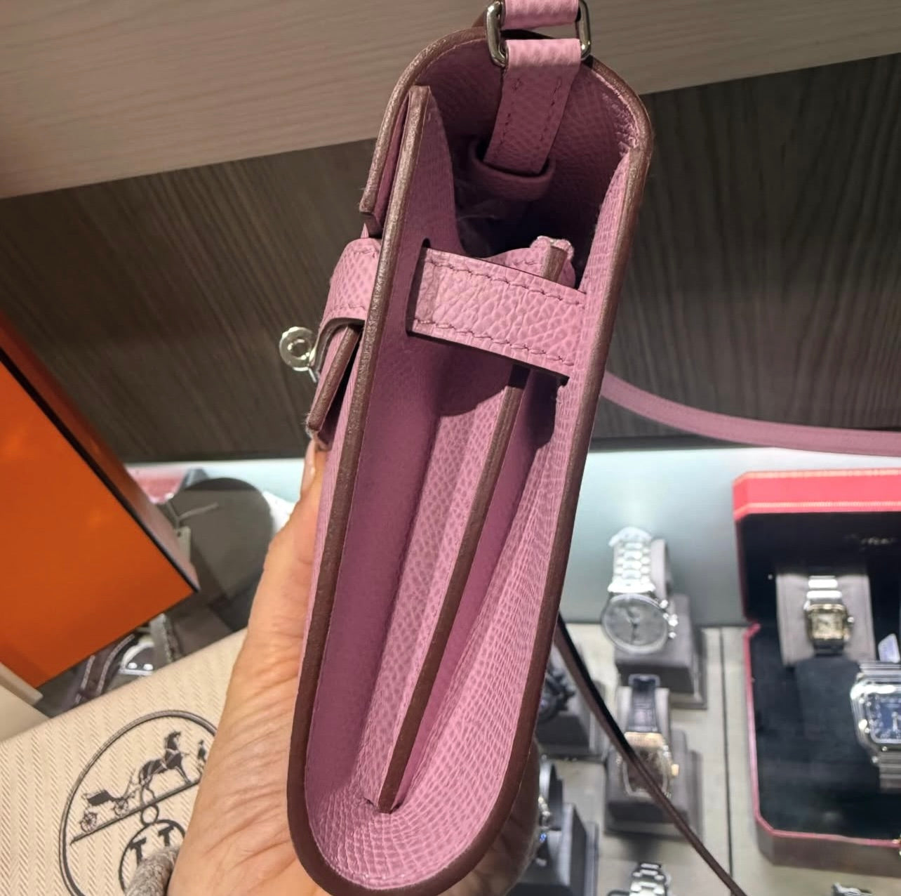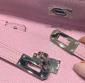 This pre-owned piece is in almost excellent condition, showing minimal signs of prior use, limited to light scratches on the hardware. The structured Epsom leather retains its shape beautifully, while the signature Kelly turn-lock adds a timeless Hermès touch.