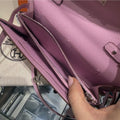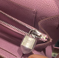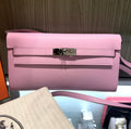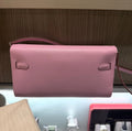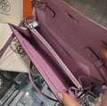 An elegant and highly coveted Hermès Kelly Wallet To Go, crafted in durable Epsom leather and featuring a stunning dual-tone color combination of Mauve Sylvestre and Jaune de Naples. Inspired by the iconic Kelly bag, this chic piece seamlessly transitions from wallet to mini crossbody with its removable strap, making it perfect for both day and evening wear.