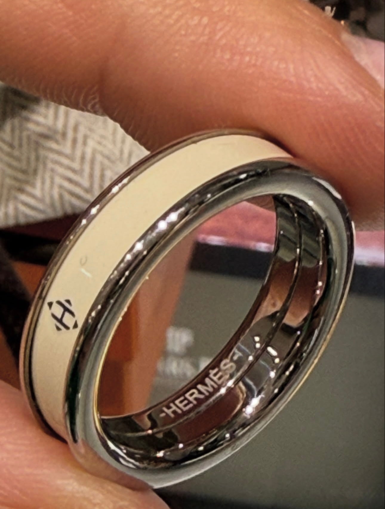Pre-Owned (Like New) Hermès Uni Ring in Crème Enamel with Palladium Plating – Size 57 (US 8) –