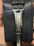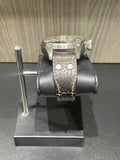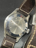 Condition: Good pre-owned condition. The case shows visible scratches consistent with wear, along with light residue present. The brown leather strap shows cracking, and the deployant buckle has light scratches. The watch remains fully functional and well preserved overall.