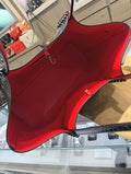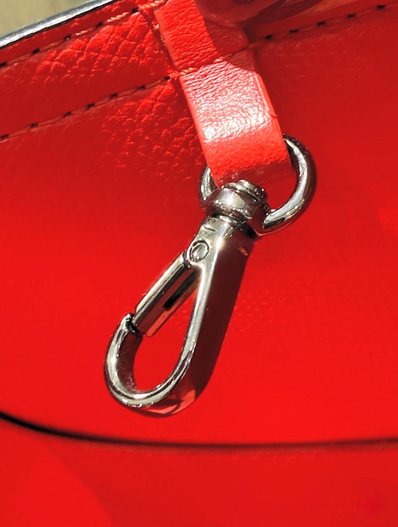 Designed with both elegance and practicality in mind, the tote features dual top handles, an open top with clip closure, and a spacious interior compartment lined in vibrant red leather. Inside, a slip pocket allows for easy organization of your essentials.