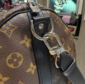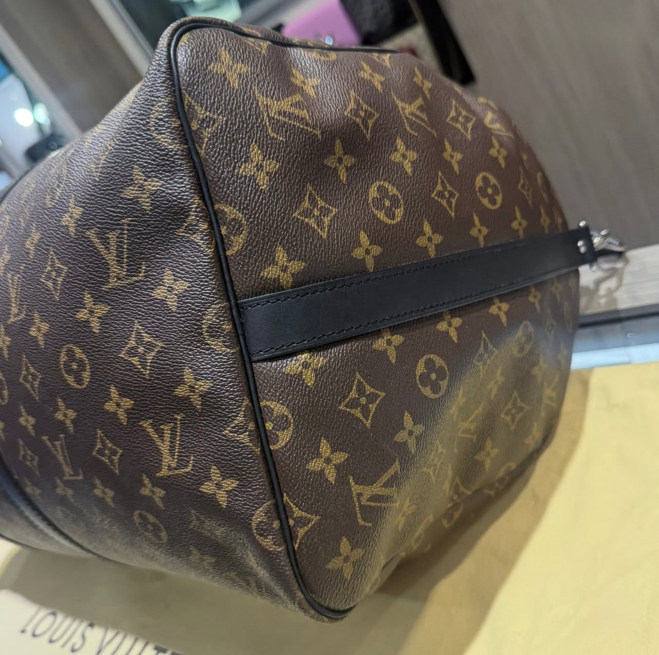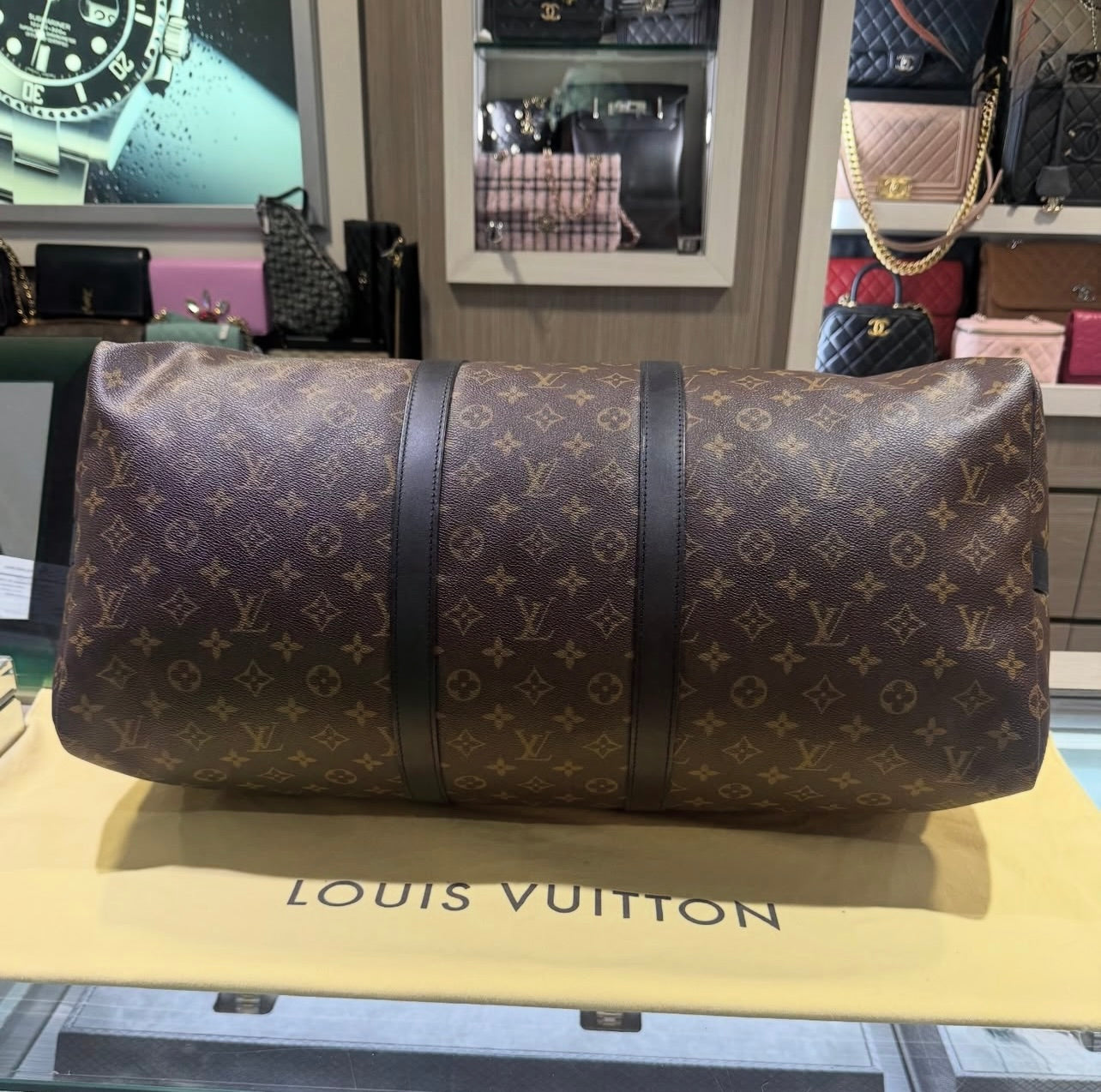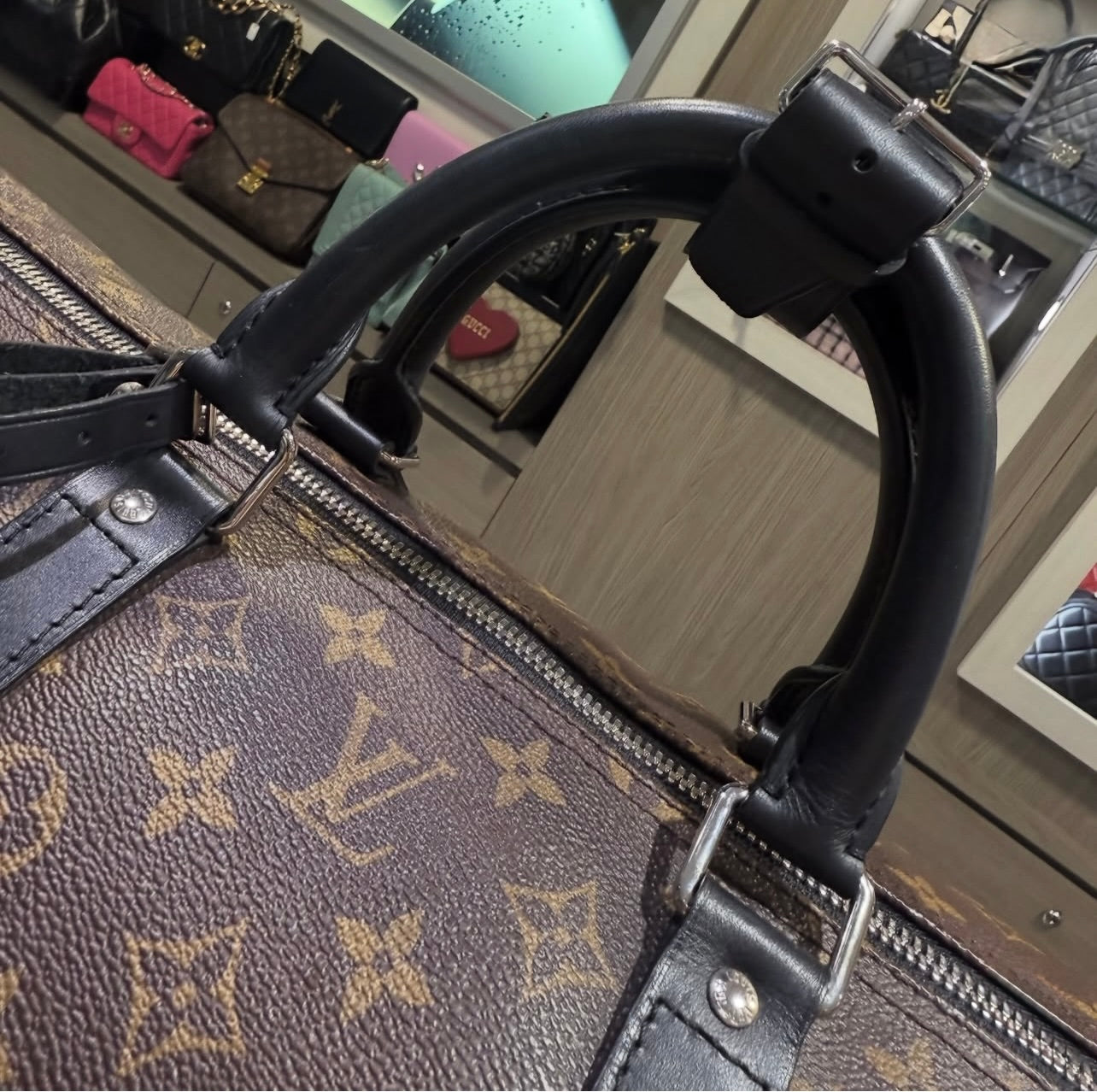 This pre-owned Louis Vuitton Keepall 55 Bandoulière in Monogram Macassar (2015) is in excellent, almost like new condition, having been storage kept with only minimal signs of handling such as light artificial scratches on the hardware and lock/key. The canvas, trim, and interior remain clean and well maintained.