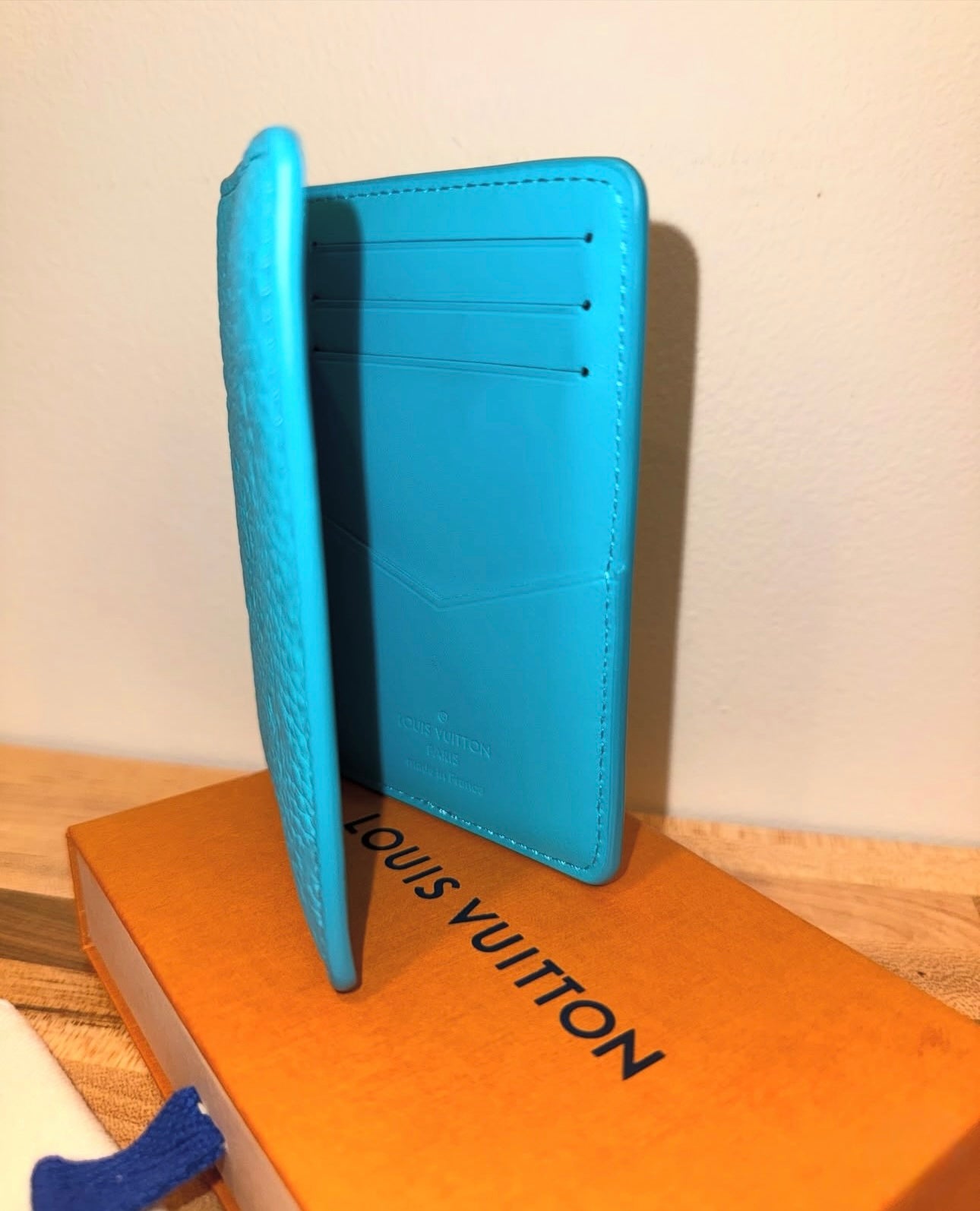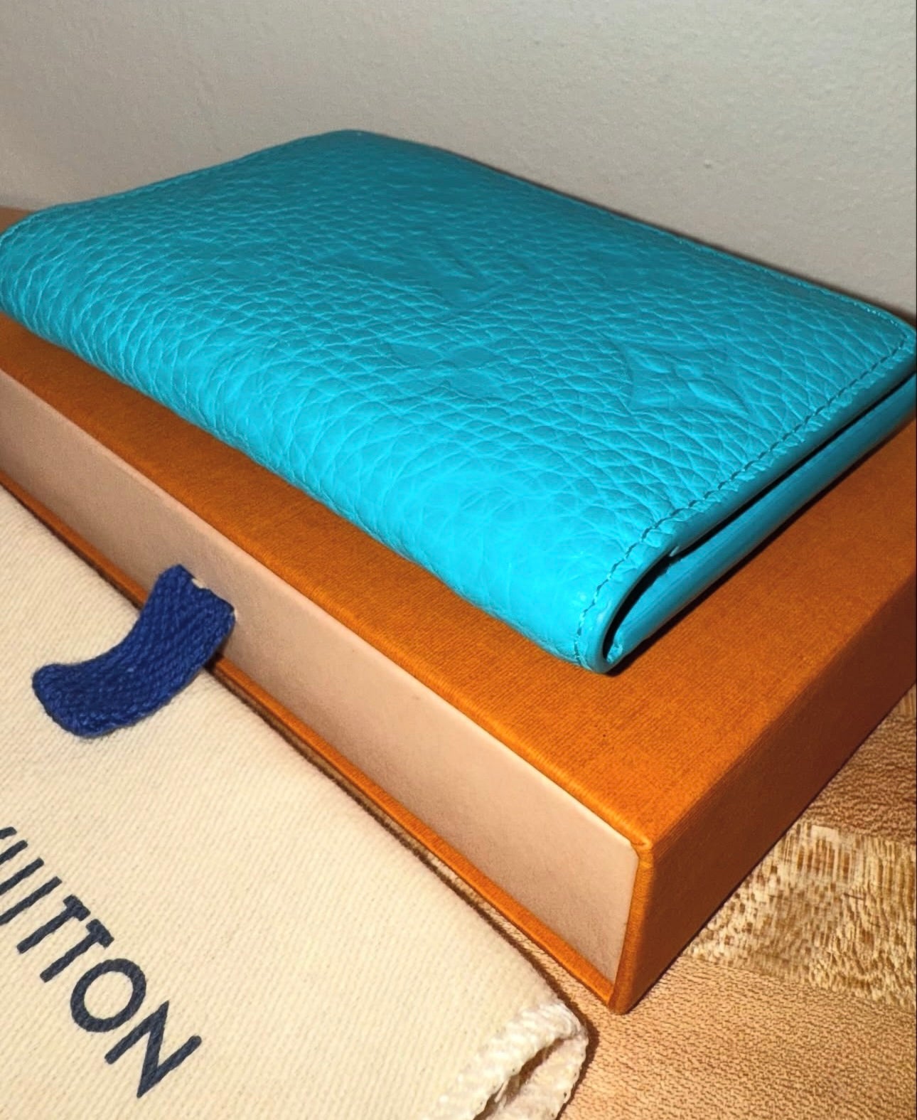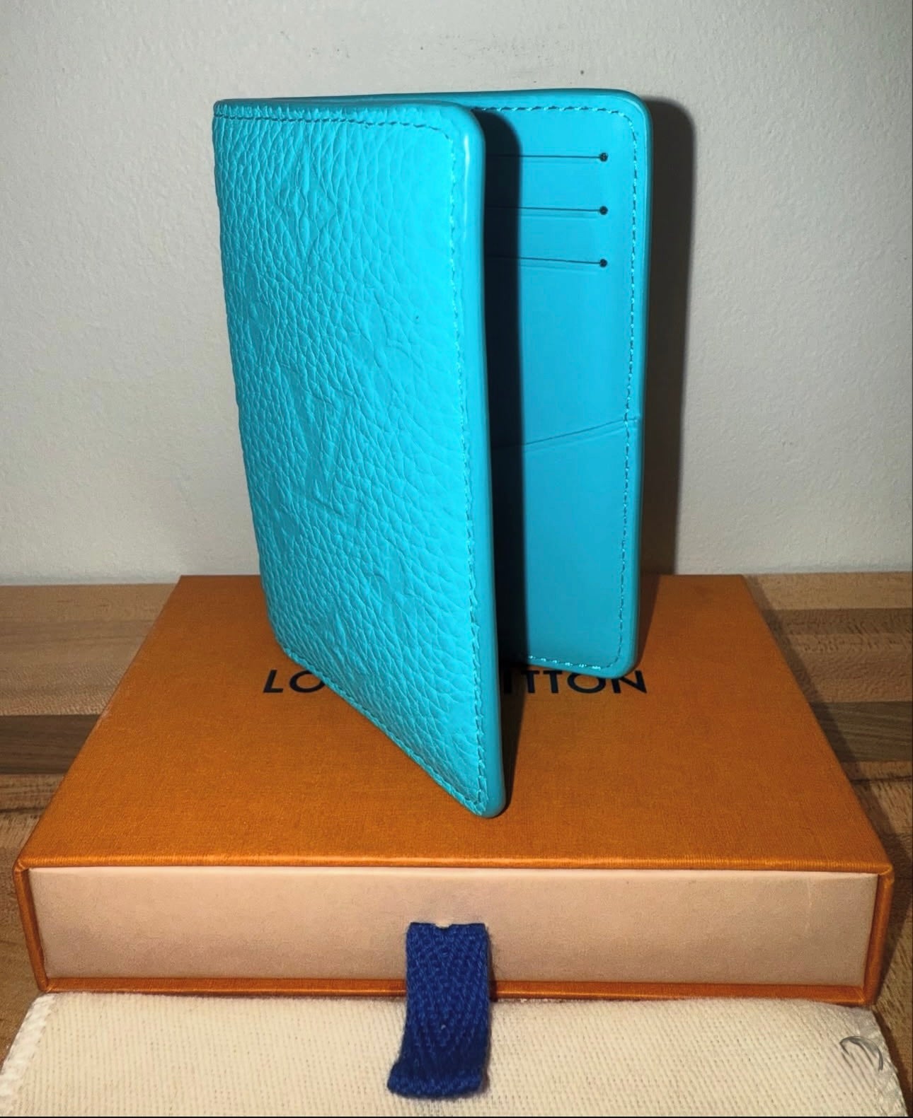 Add a pop of color to your essentials with this pre-owned Louis Vuitton Pocket Organizer, crafted in luxurious grained Taurillon cowhide leather embossed with the iconic Monogram motif. The bold turquoise hue gives this compact wallet a fresh, youthful edge while maintaining the timeless elegance and superior craftsmanship Louis Vuitton is known for.