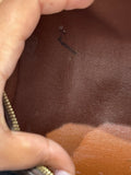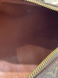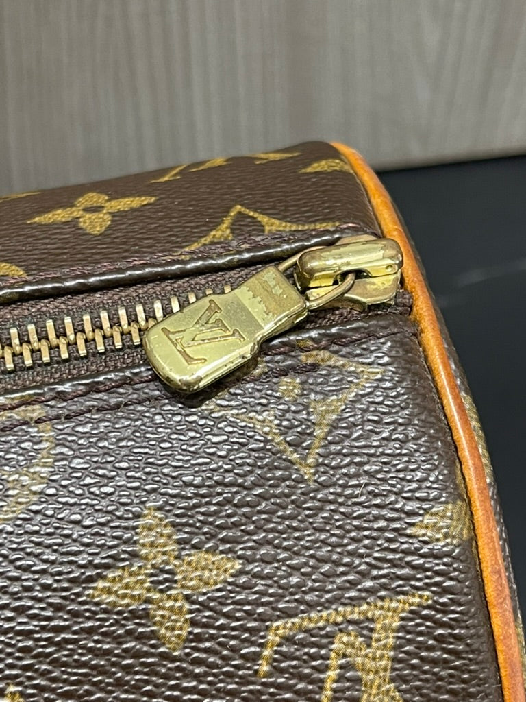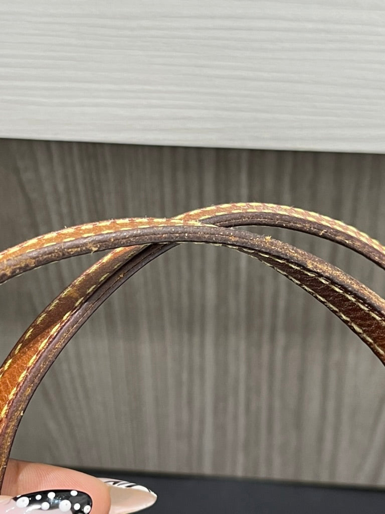 This bag is in fair pre-owned condition. It shows heavy patina throughout, a relaxed shape from wear, fraying and discoloration of handles, scuffing on corners, a faded/discolored zipper, and marks on the interior. Despite these signs of wear, the bag retains its vintage charm and collectible appeal.