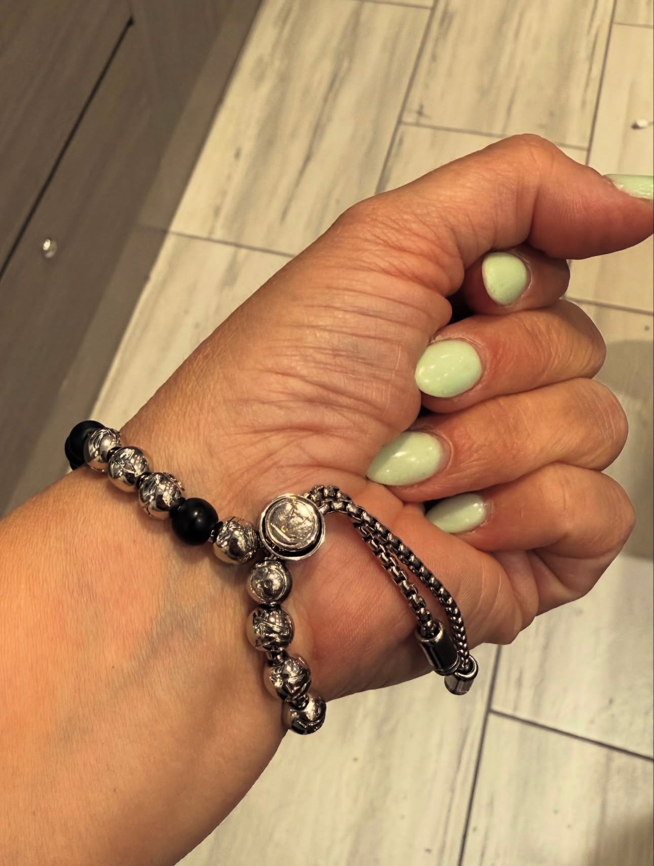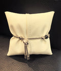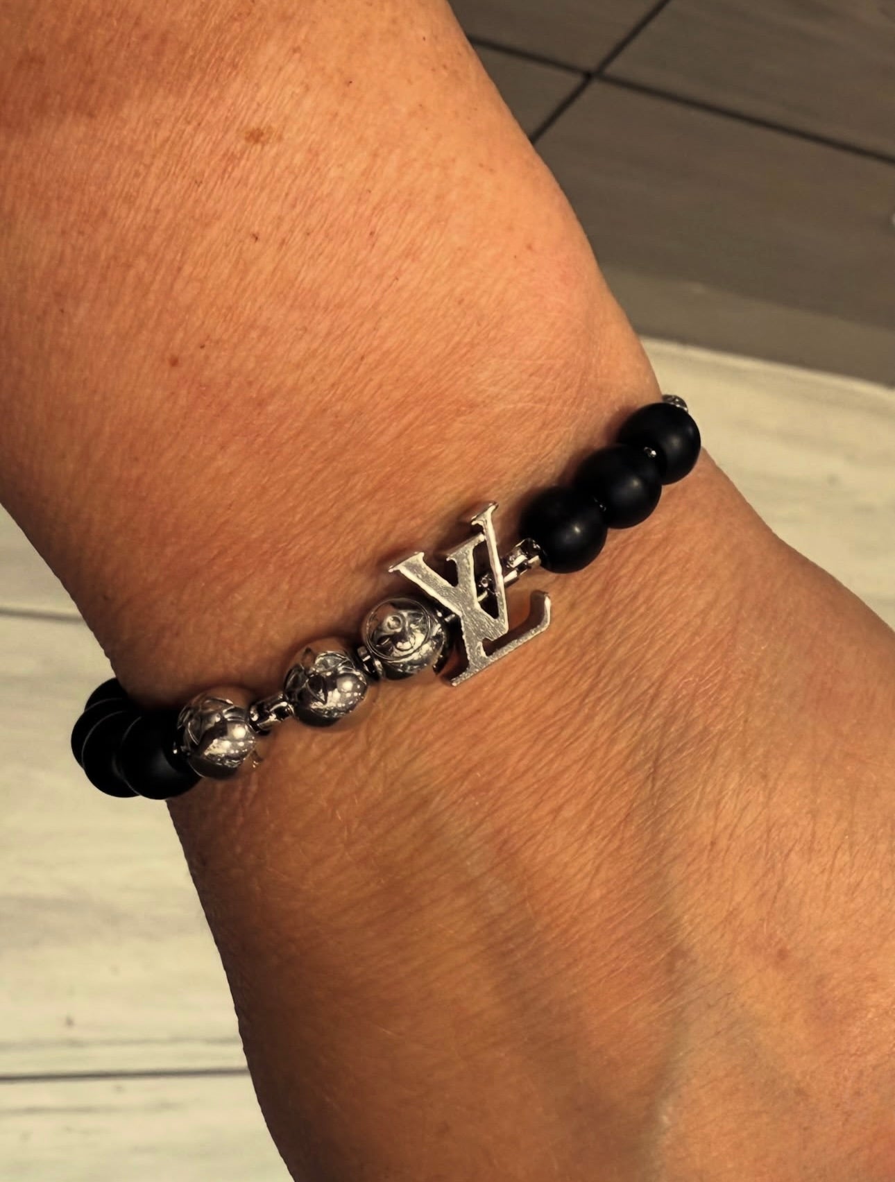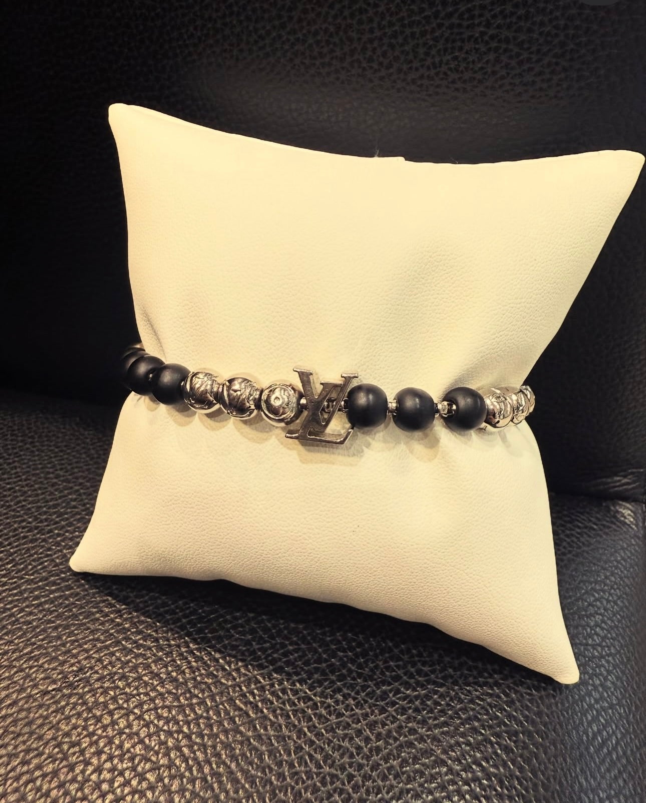 This pre-owned Louis Vuitton bracelet features a stylish mix of dark and light beads on palladium-plated brass, with an adjustable fit (5" to 8.75" circumference). In very good condition with minor wear and light scratches on the metal, it comes with bracelet only.