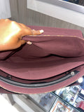 The exterior features a convenient rear zipper pocket and an adjustable crossbody strap with a 23" drop for comfortable, hands-free wear. The flap and buckle closure opens to reveal a spacious dark purple fabric-lined interior, complete with an interior zipper pocket, three slip pockets, two pen slots, and a padded compartment ideal for a laptop or documents.