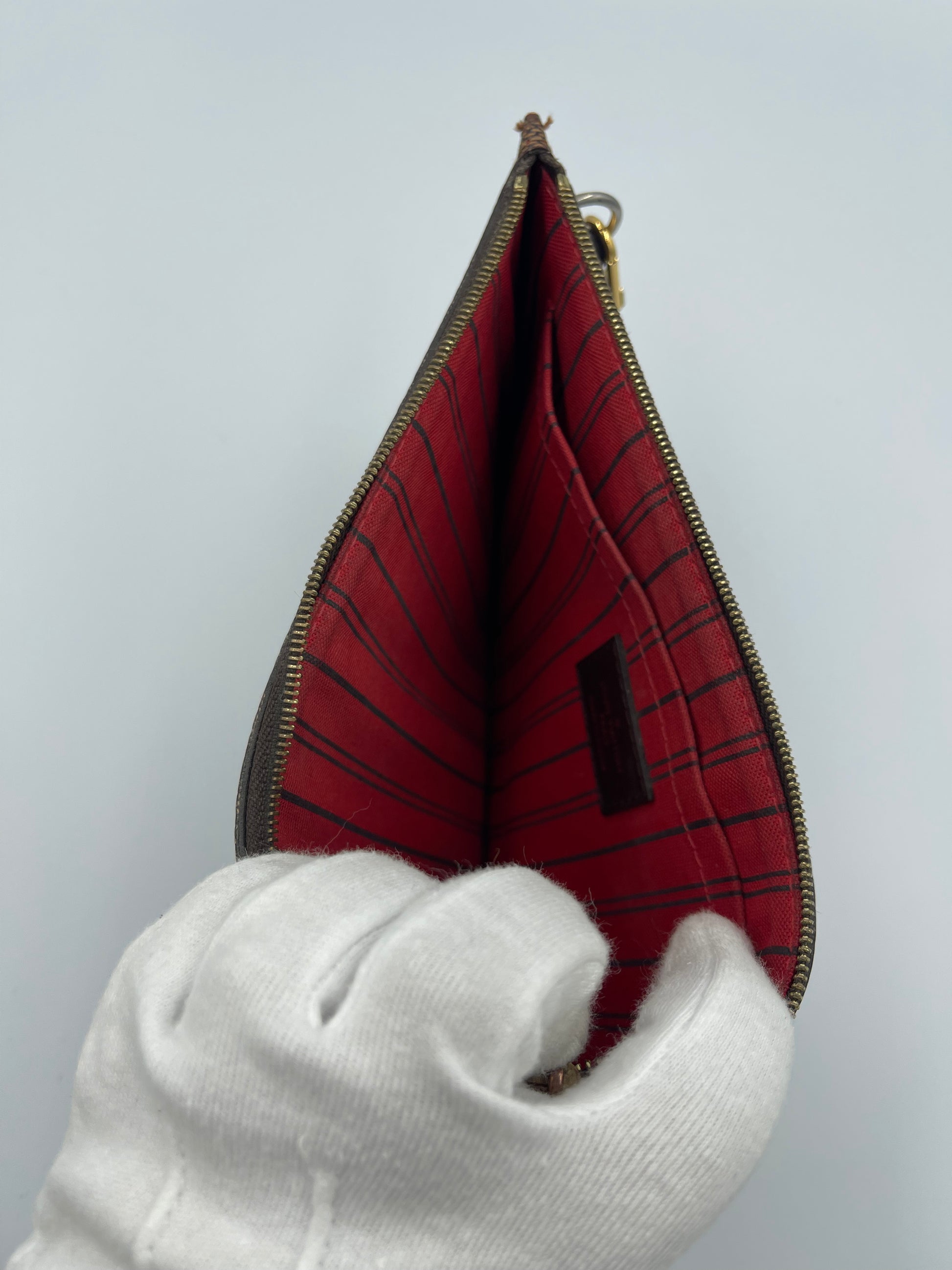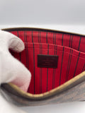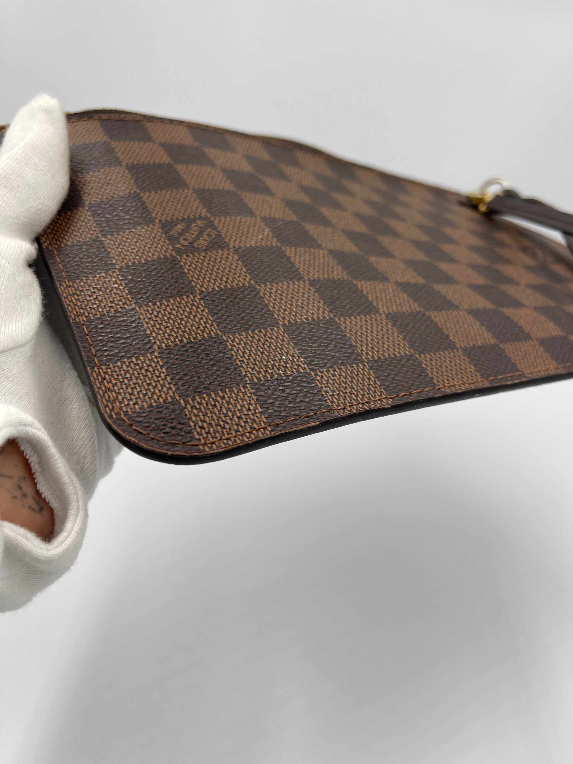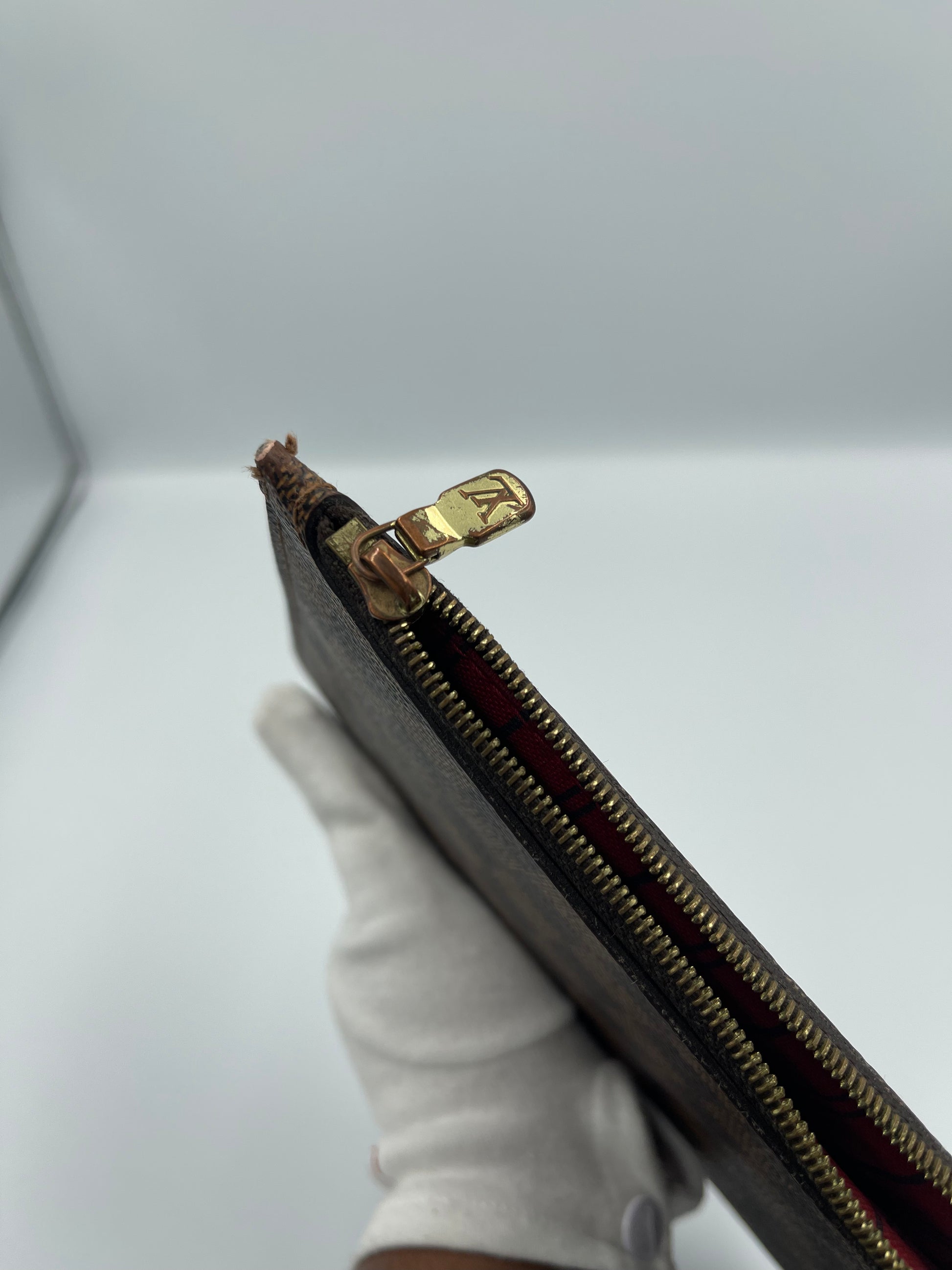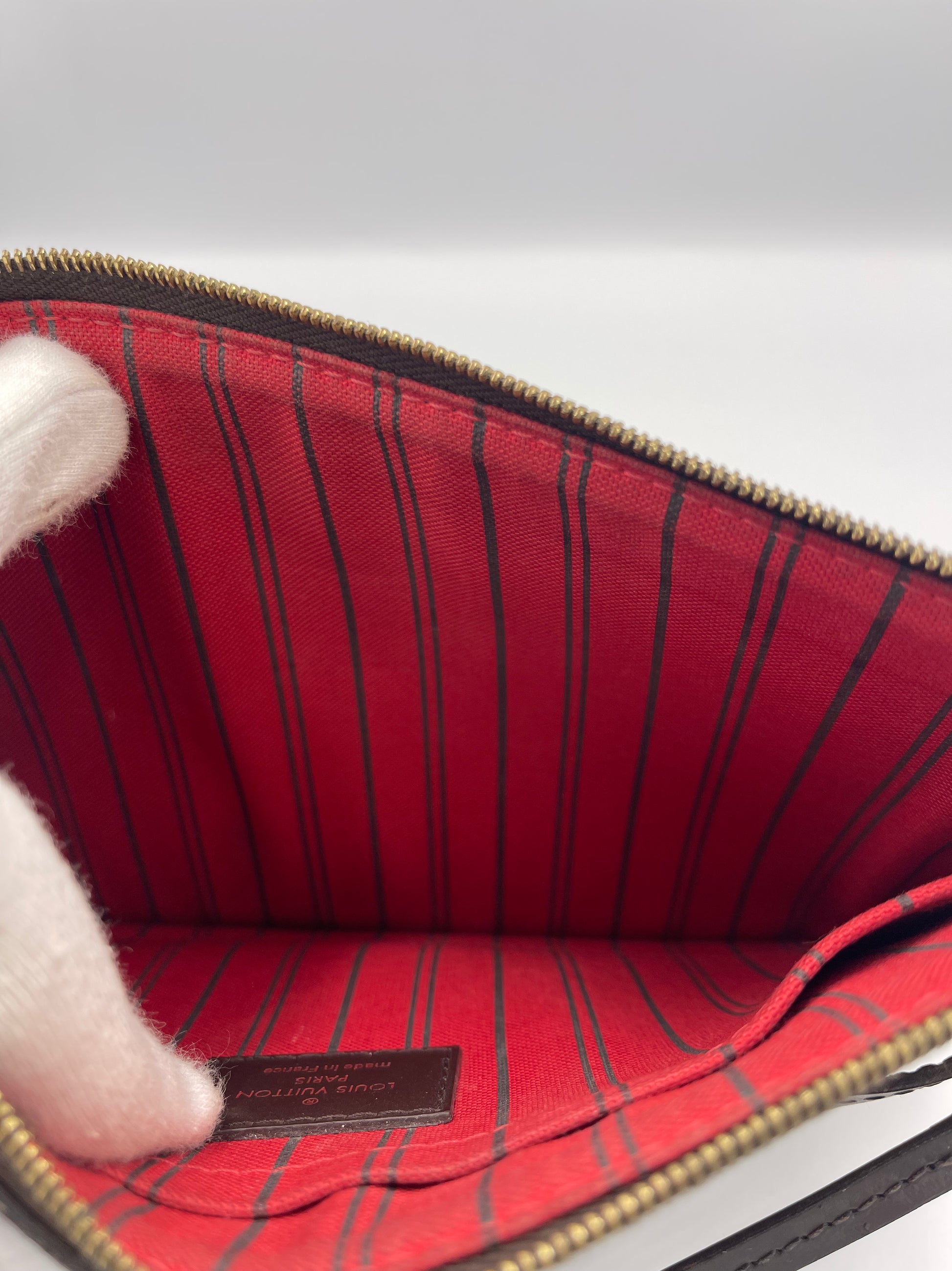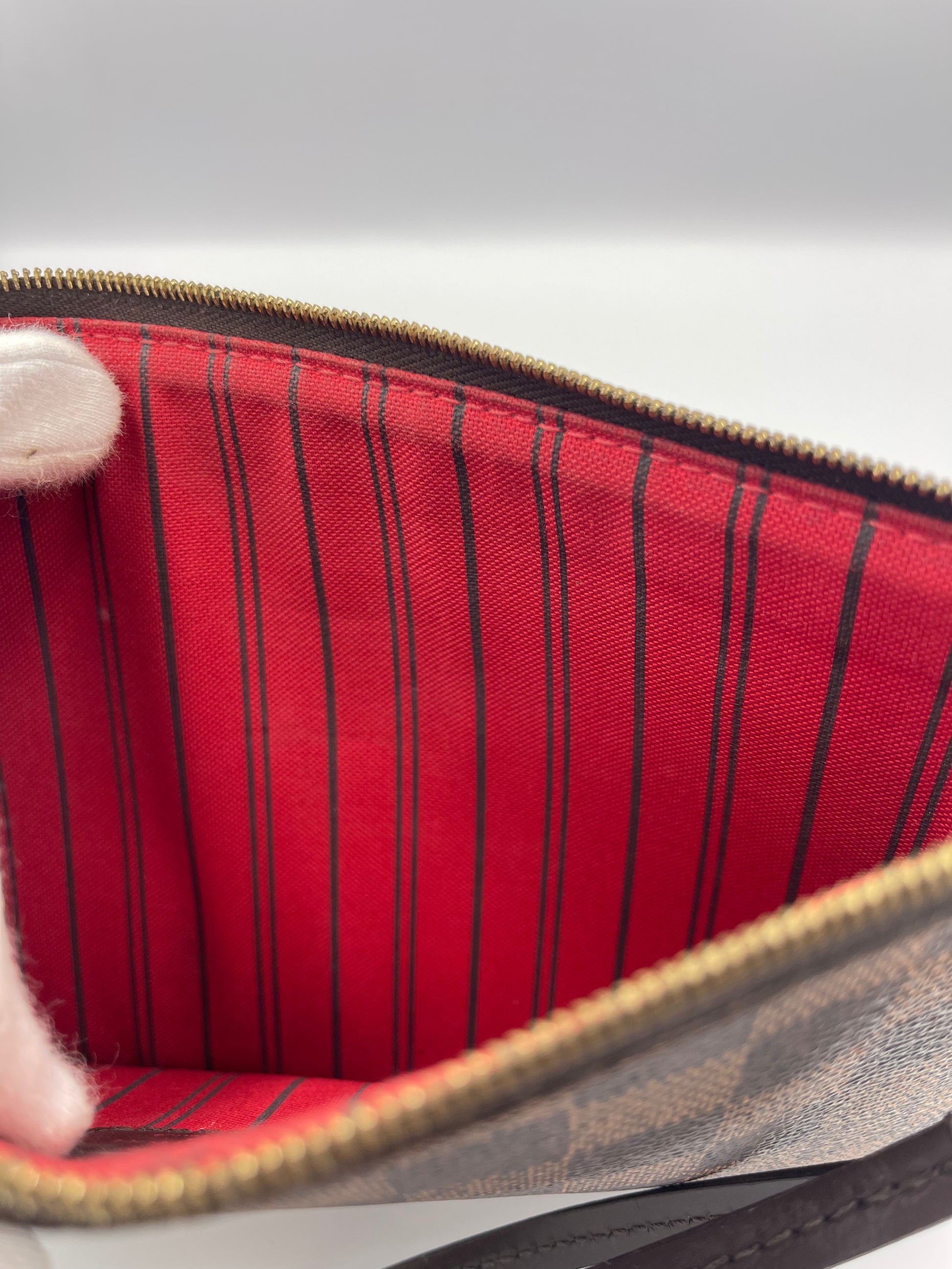 This elegant and versatile Louis Vuitton Damier Ebene Wristlet is crafted from the house’s signature checkerboard coated canvas, paired with a removable leather wrist strap and accented with gold-tone hardware. The top zipper opens to a striped cherry-red fabric interior with a convenient patch pocket, perfect for carrying your daily essentials with ease.