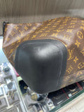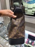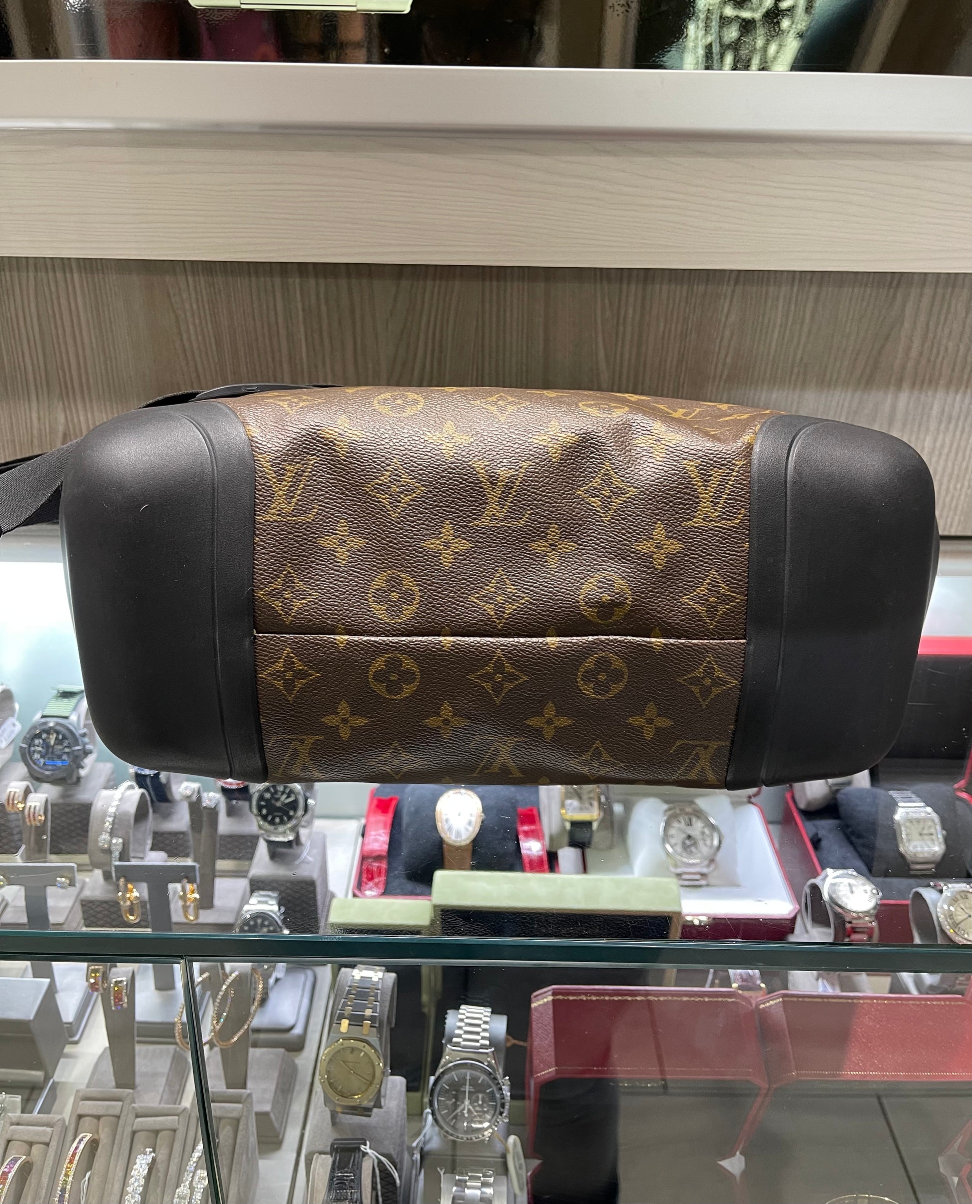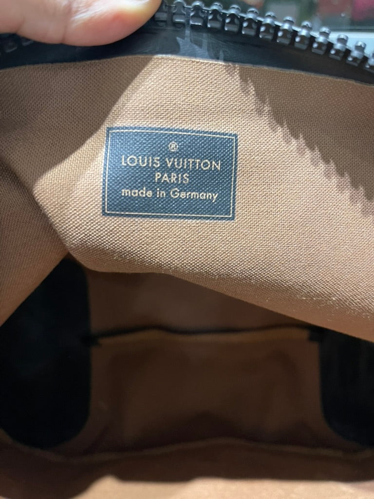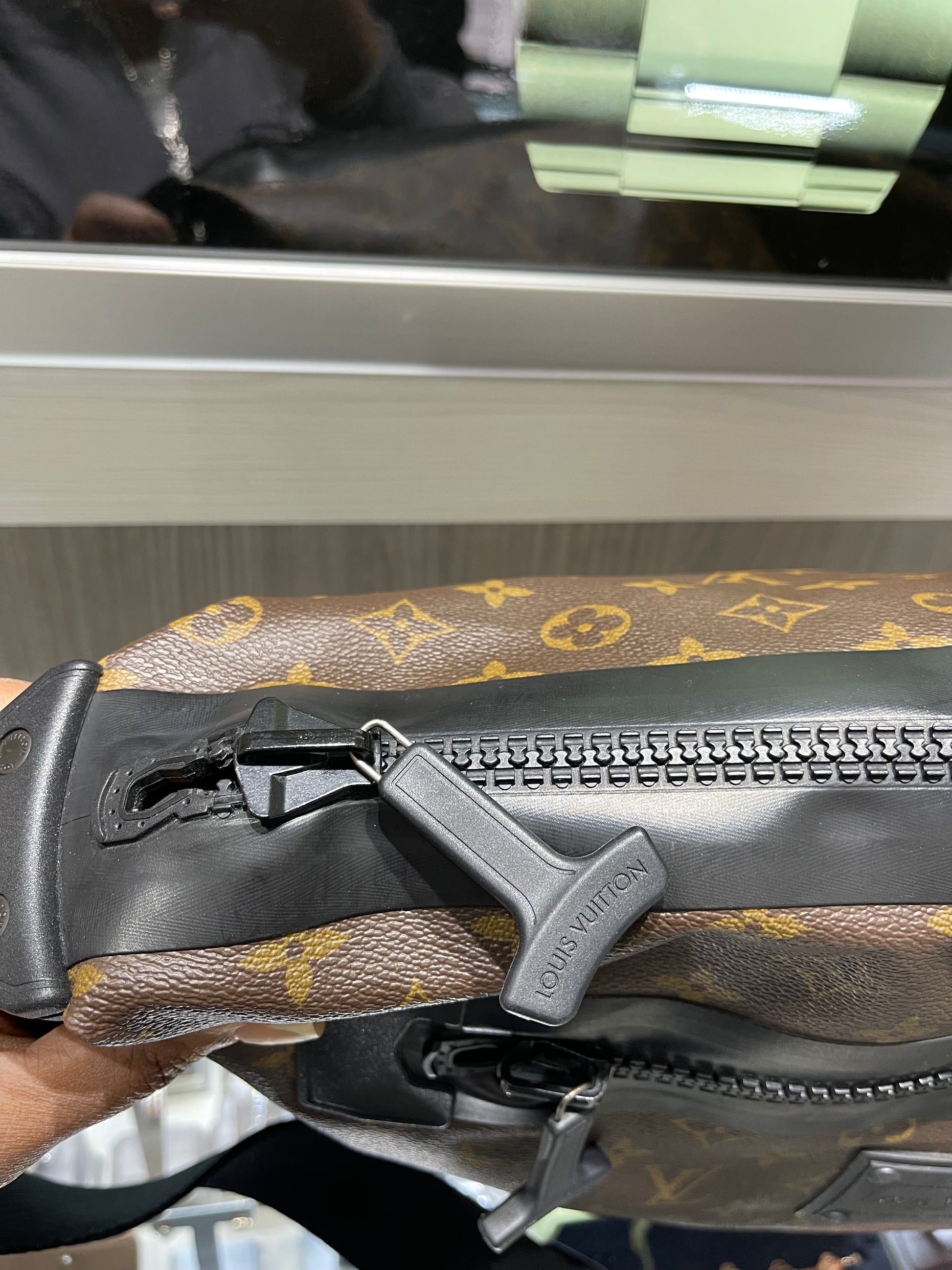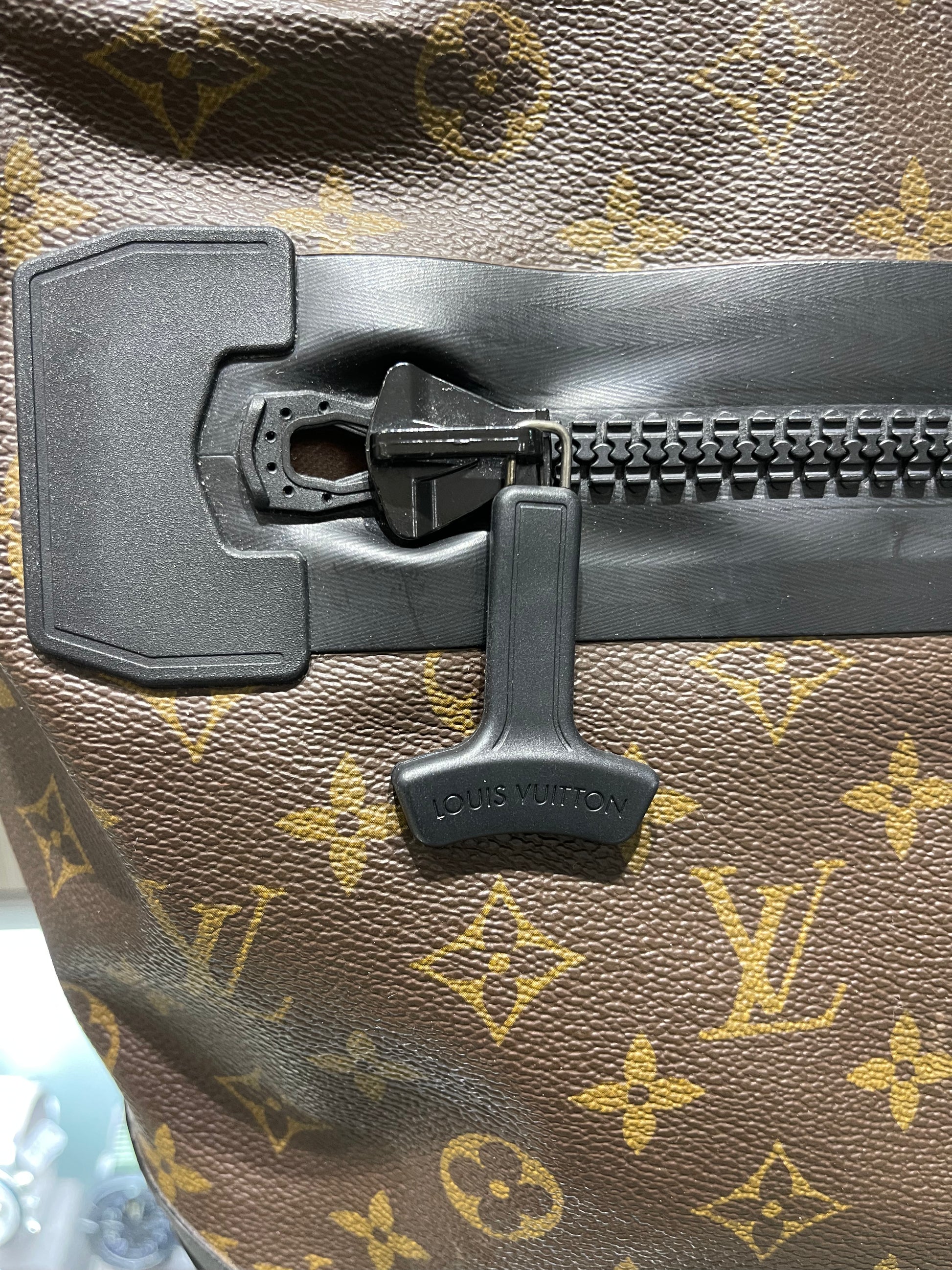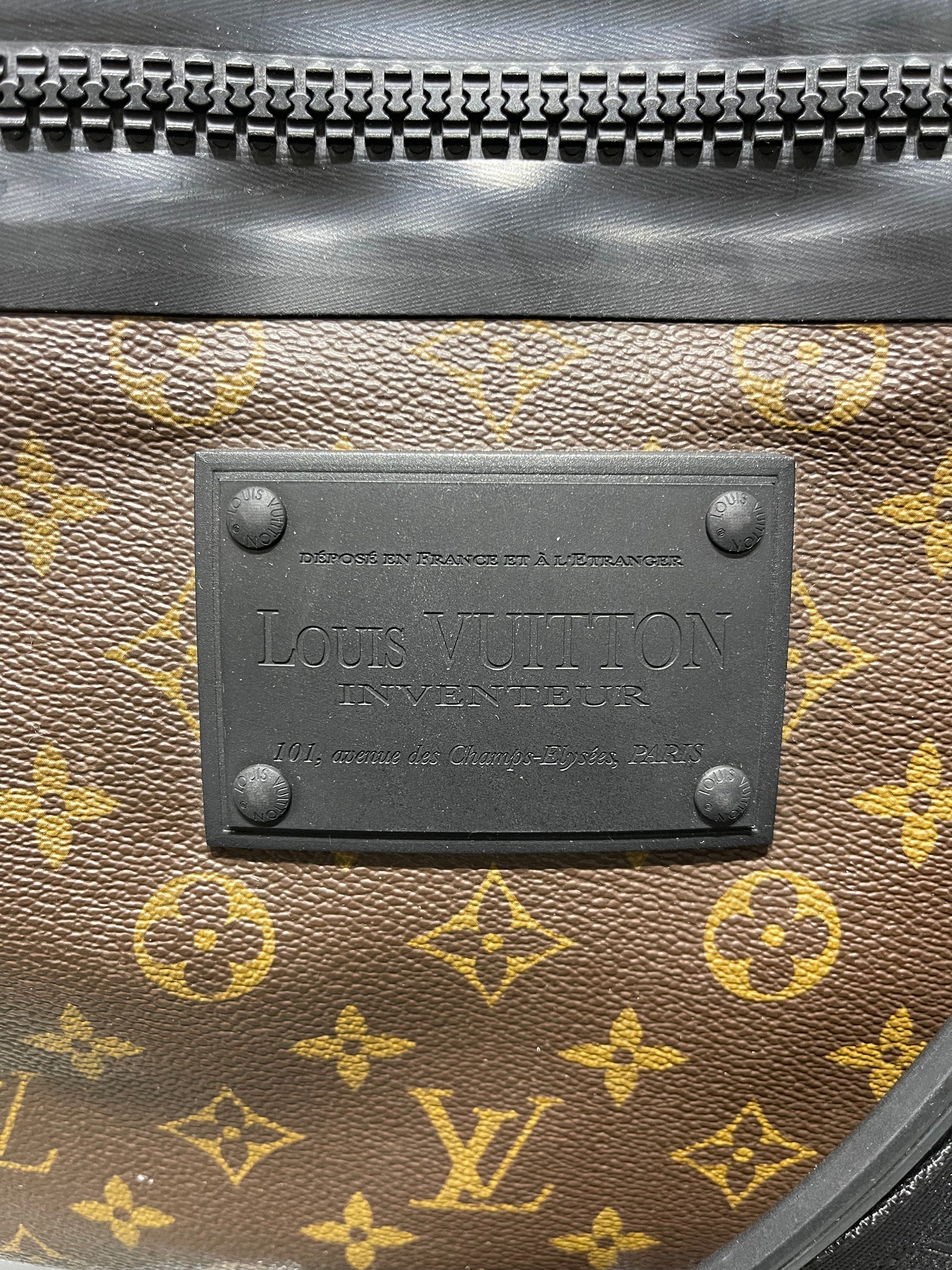 It features gunmetal hardware, water-resistant black coated leather trim, and a signature Louis Vuitton Inventeur plate on the front. The top zipper with weatherproof taping ensures your belongings stay protected, while the spacious canvas-lined interior and multiple zipper compartments provide ample organization.