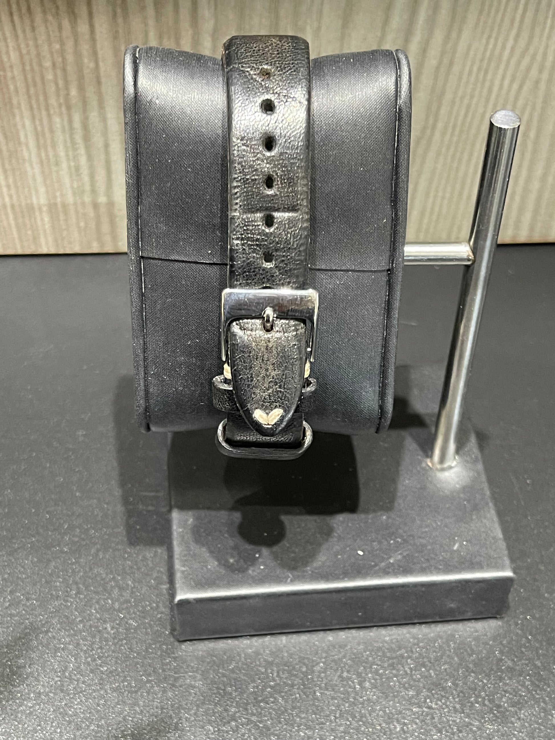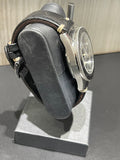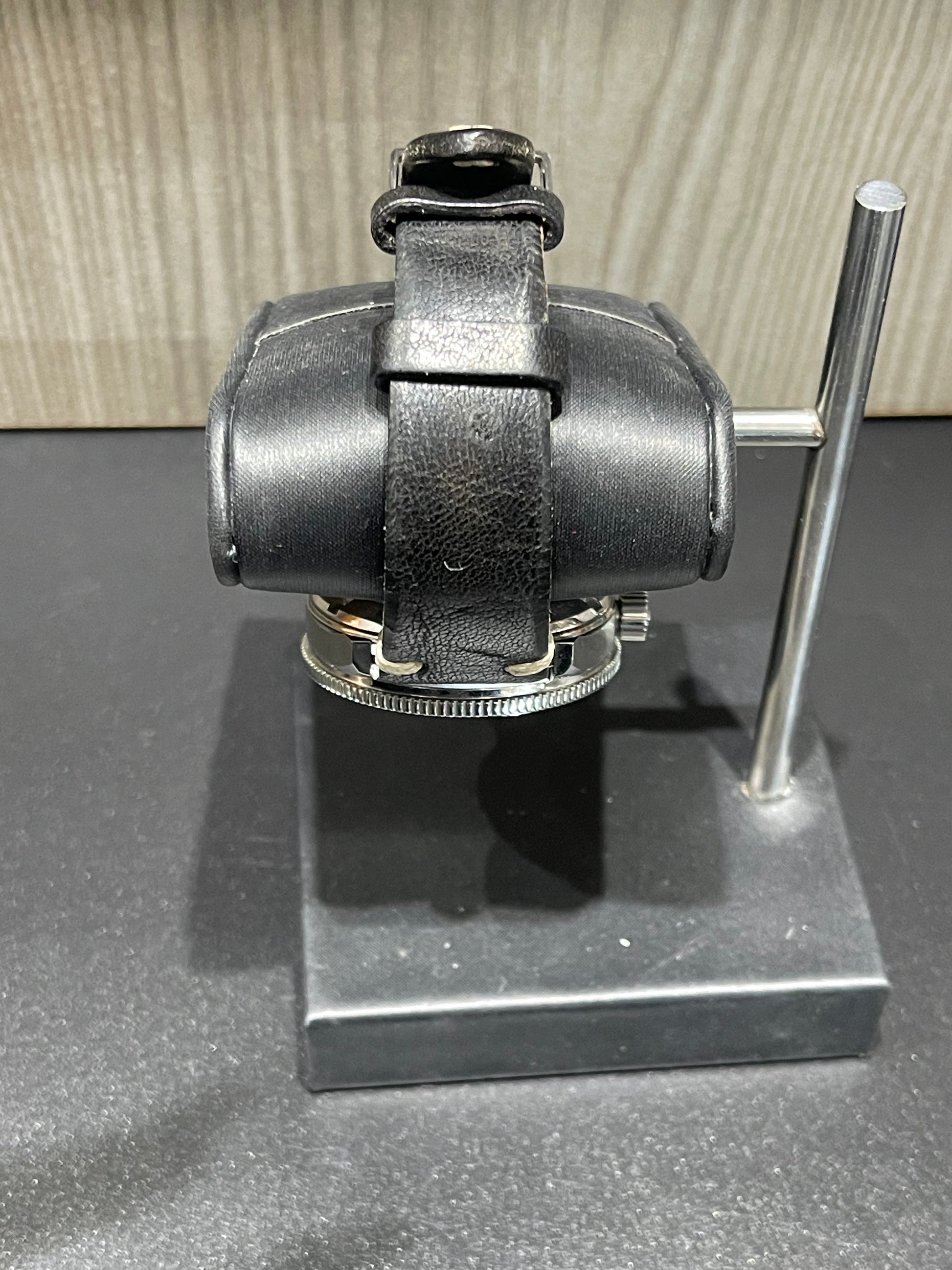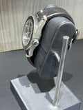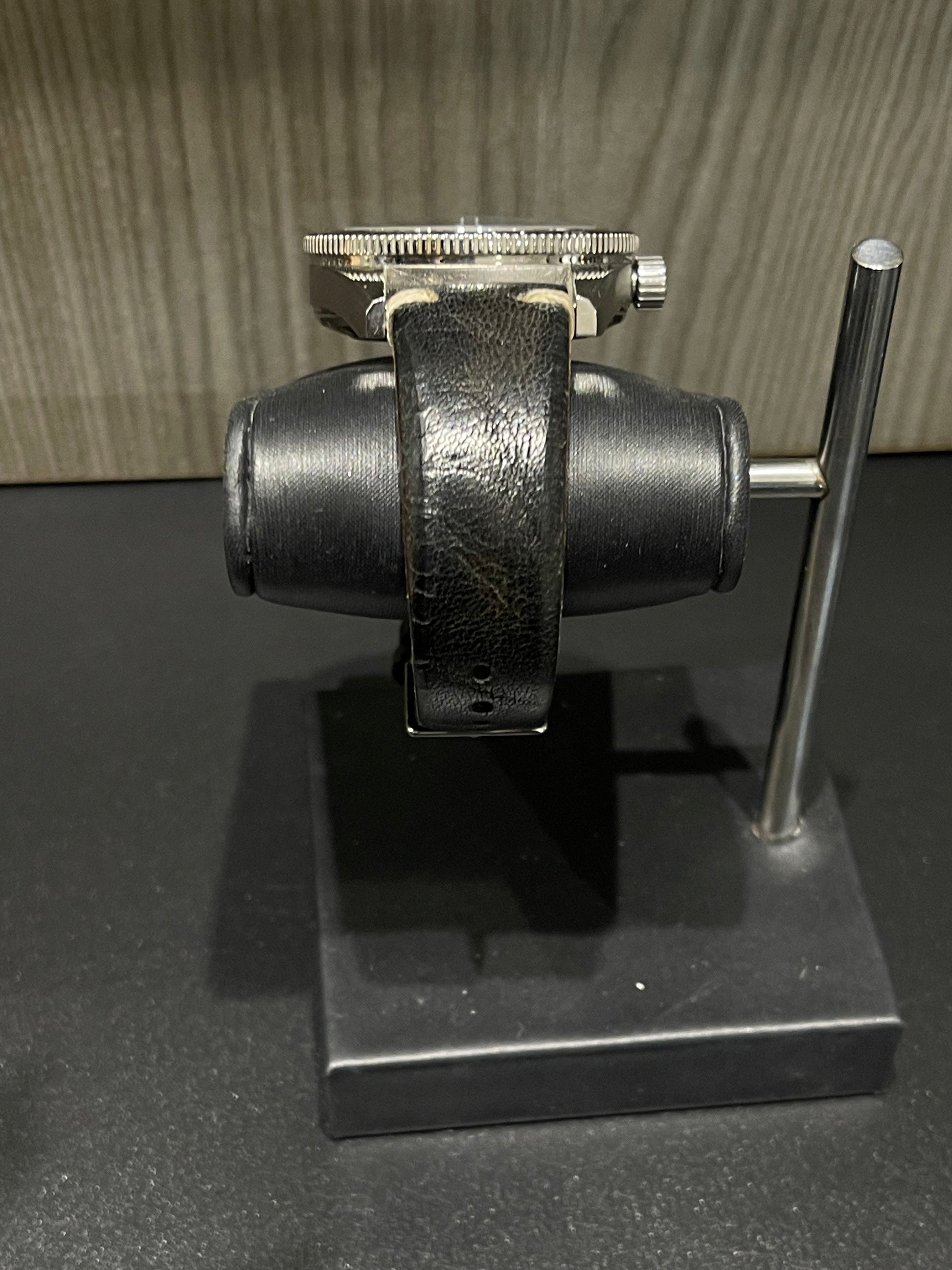 Condition: Very good pre-owned condition with light signs of wear, including light scratches on the case and light residue present. The leather strap shows wear, including fraying along the edges, cracking, scuffing, and minor discoloration. The watch functions properly and presents well overall.