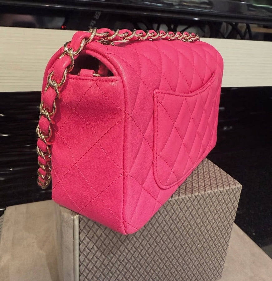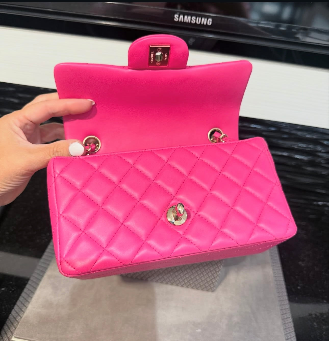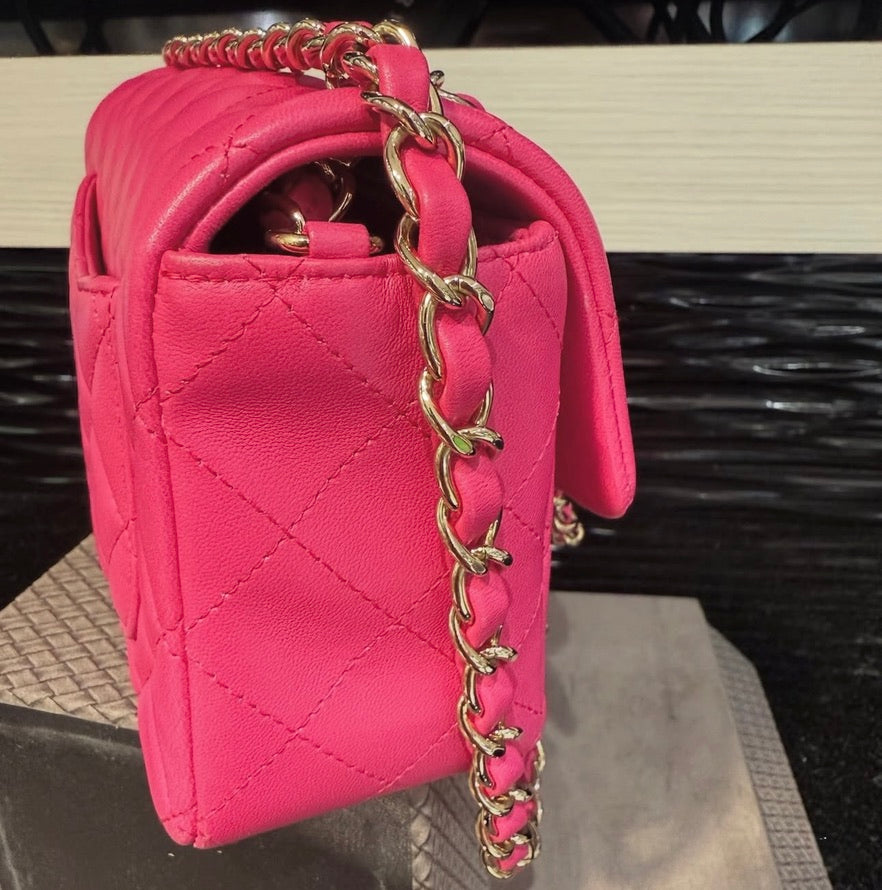 Feminine and timeless, the Chanel Classic Mini Rectangular Flap in soft pink lambskin with aged gold hardware is a coveted piece that embodies the elegance of the House’s most iconic design. Crafted in 2015–2016 (21 series), this compact yet versatile bag is perfect for both day and evening wear, offering the right balance of charm and practicality.