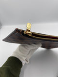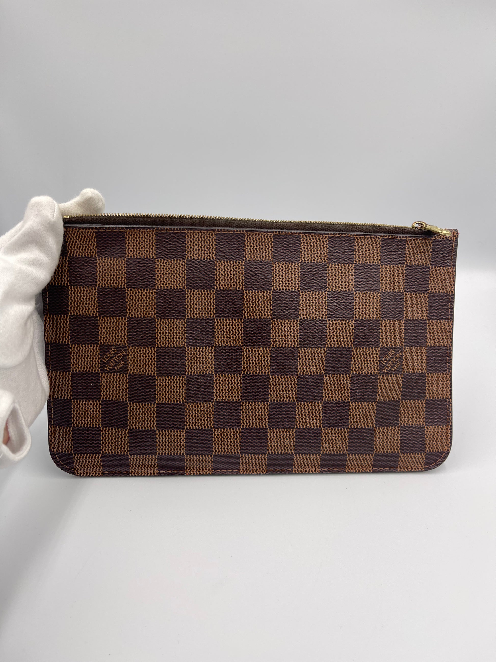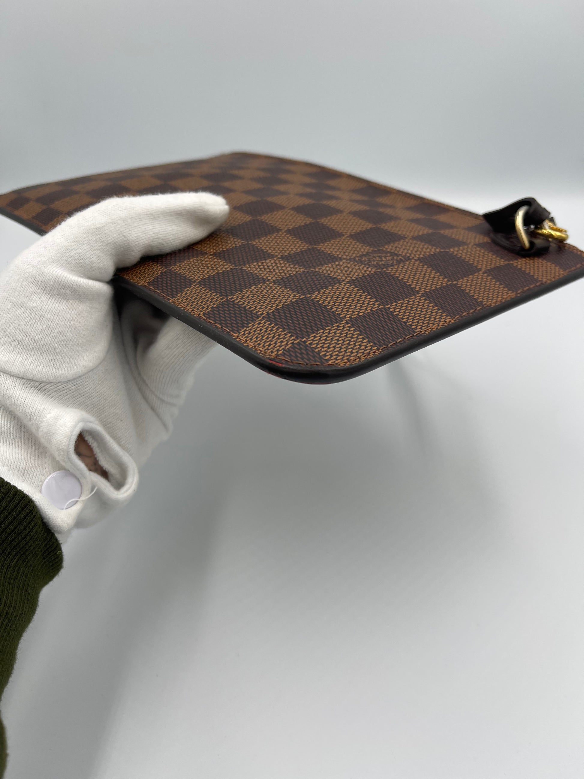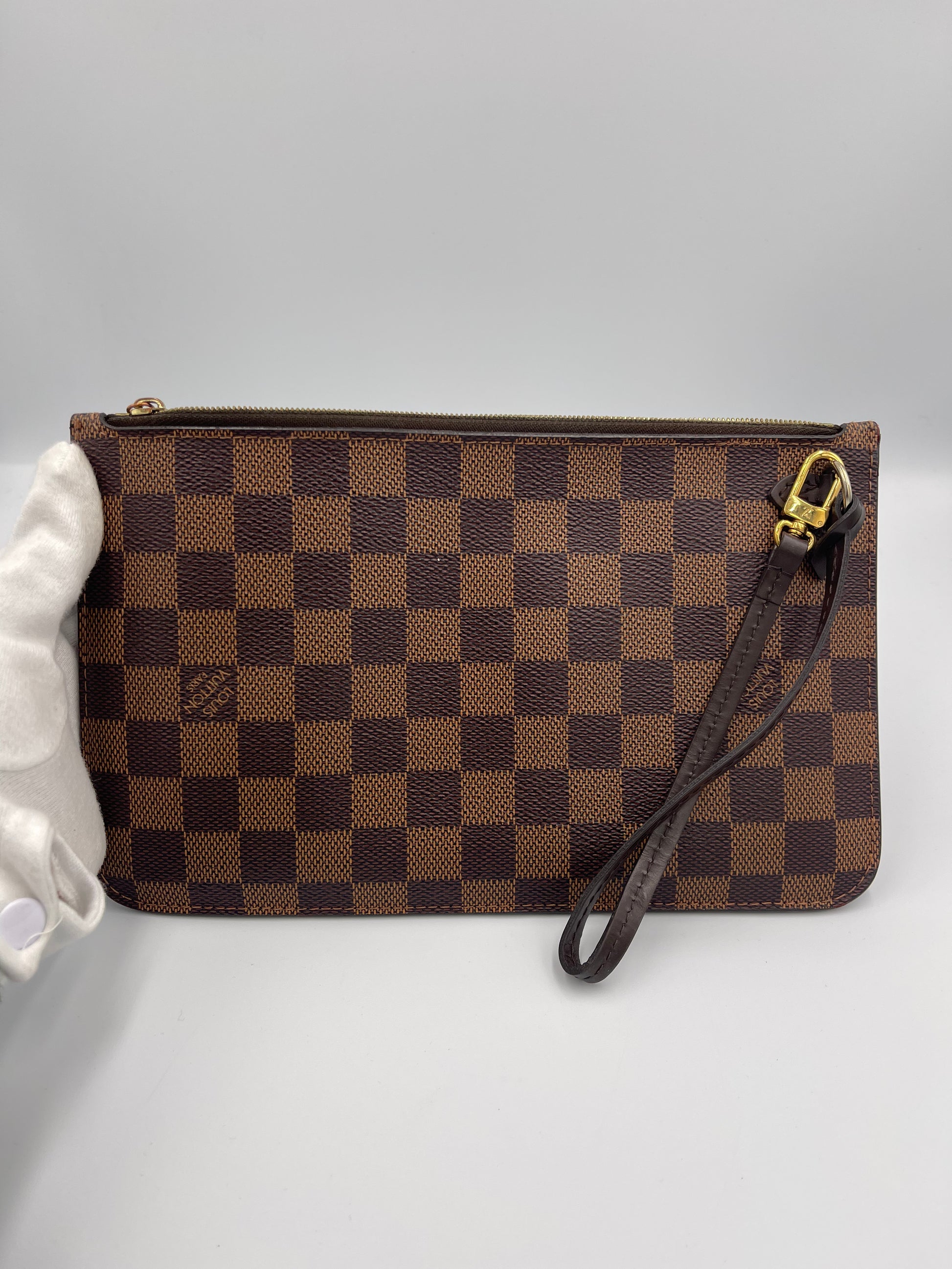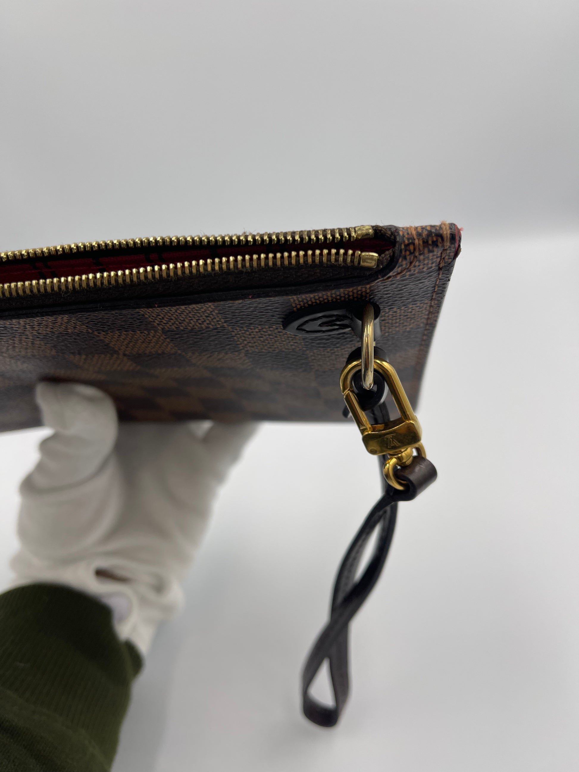 This elegant and versatile Louis Vuitton Damier Ebene Wristlet is crafted from the house’s signature checkerboard coated canvas, paired with a removable leather wrist strap and accented with gold-tone hardware. The top zipper opens to a striped cherry-red fabric interior with a convenient patch pocket, perfect for carrying your daily essentials with ease.