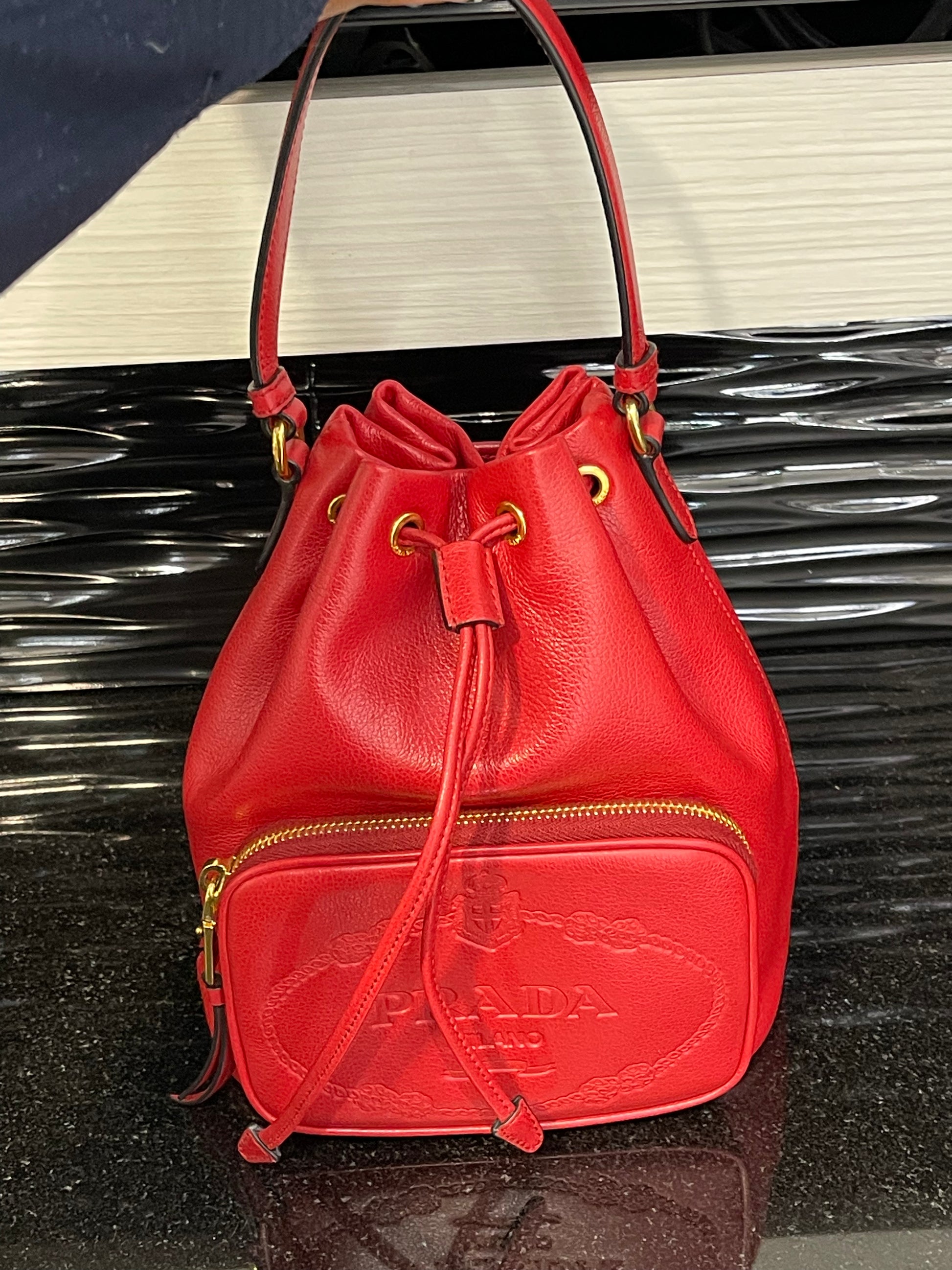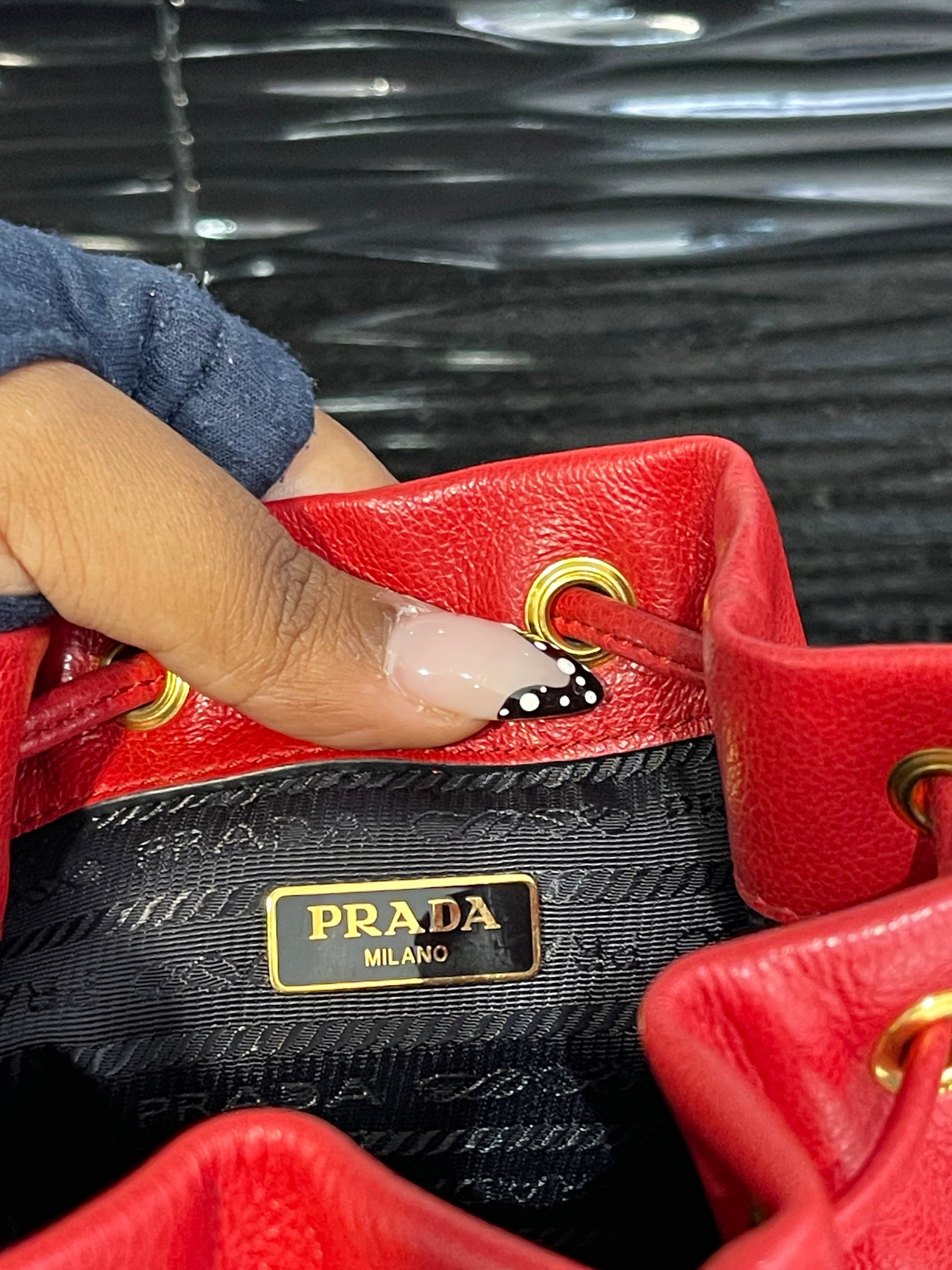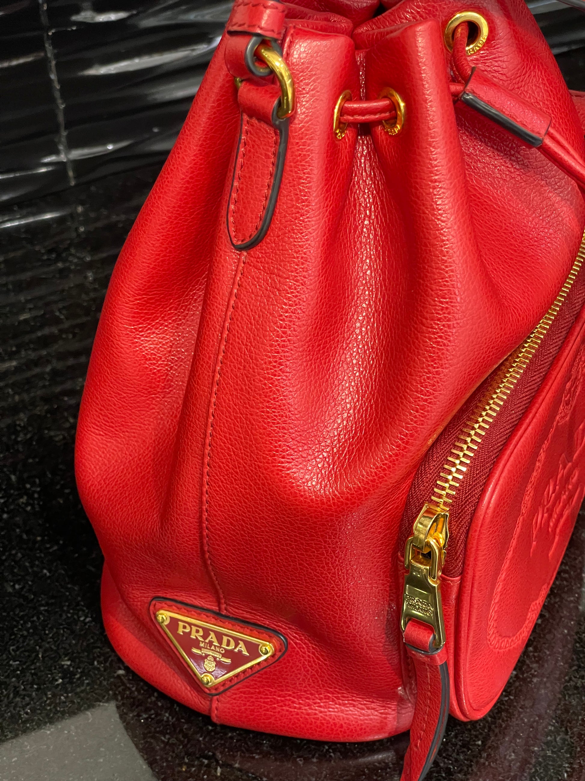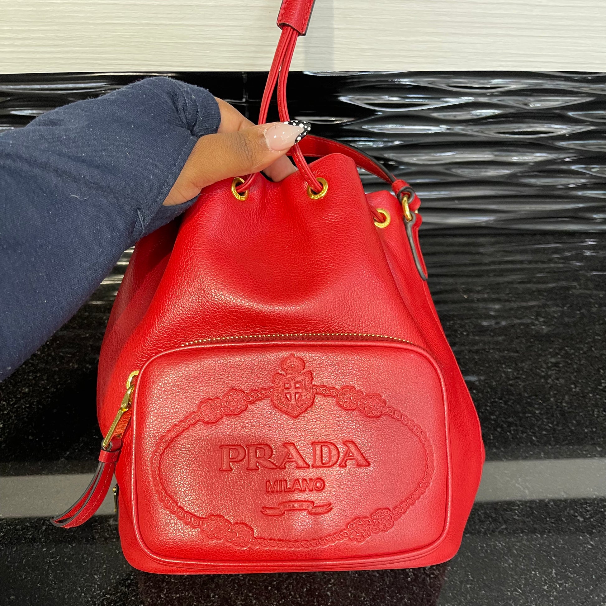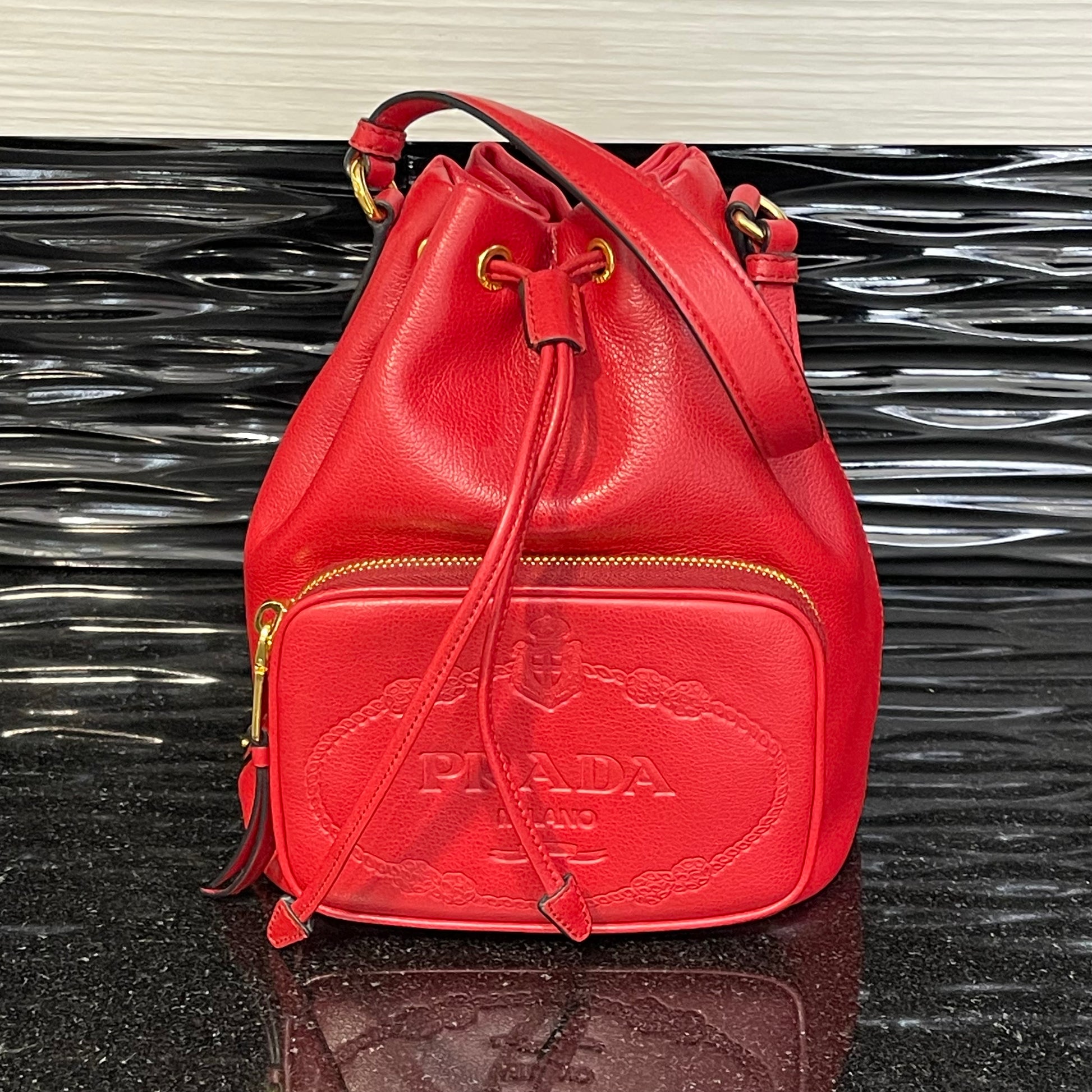 Pre-owned Prada Glace Calf Logo Embossed Bucket Bag Red