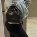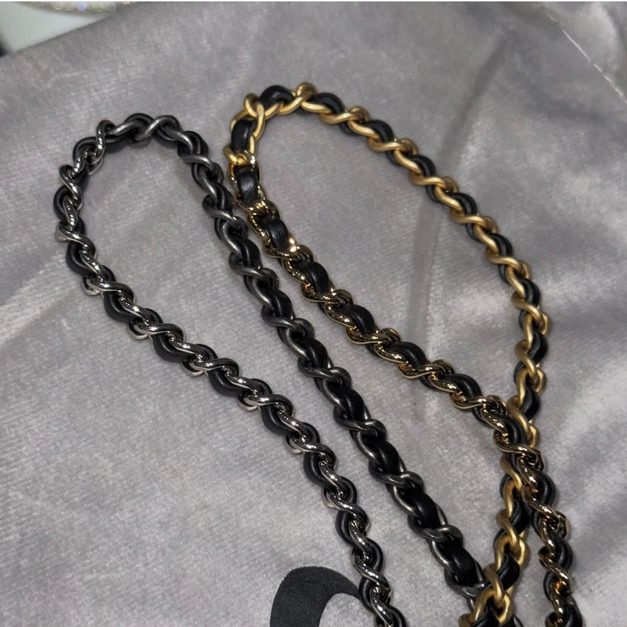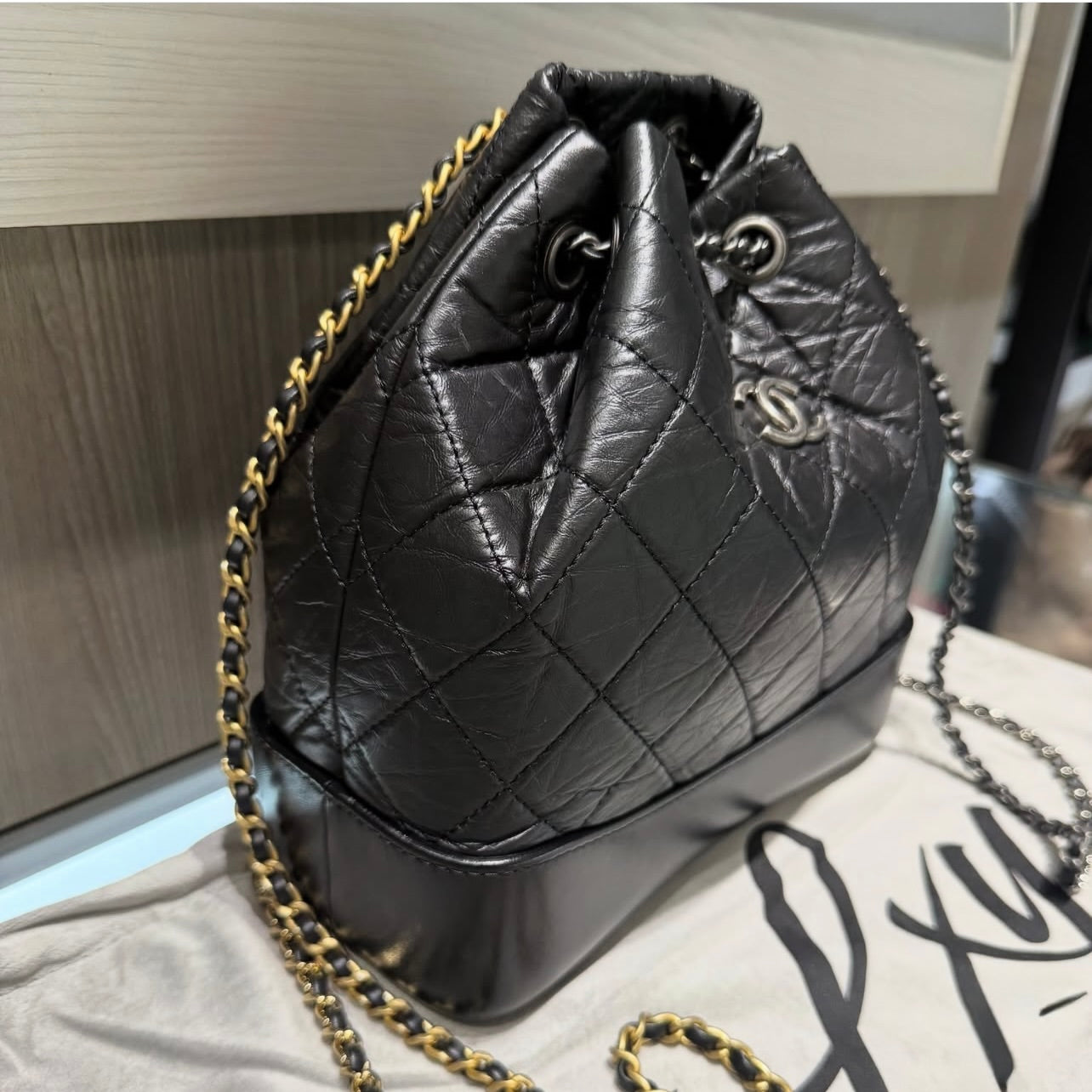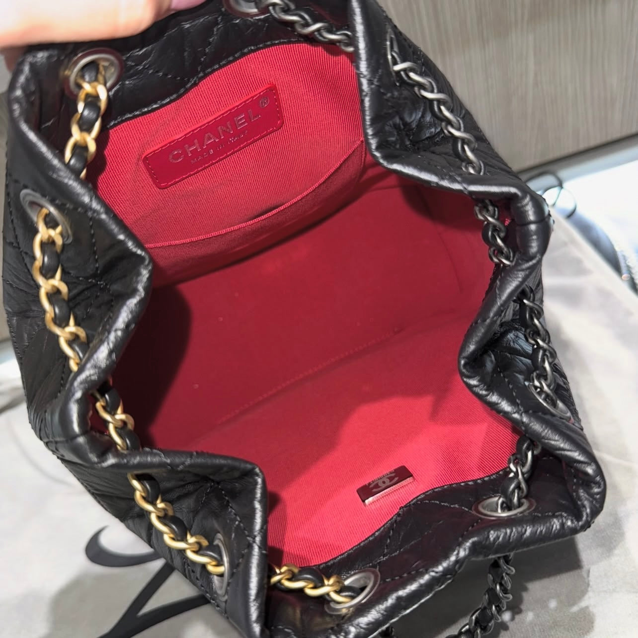 Blending modern edge with classic Chanel style, it showcases a quilted body, smooth leather base, and multi-metal chain-link straps combining gold, silver, aged gold, and ruthenium. The chain straps weave through upper grommets, creating both the handles and a secure drawstring-style closure.