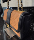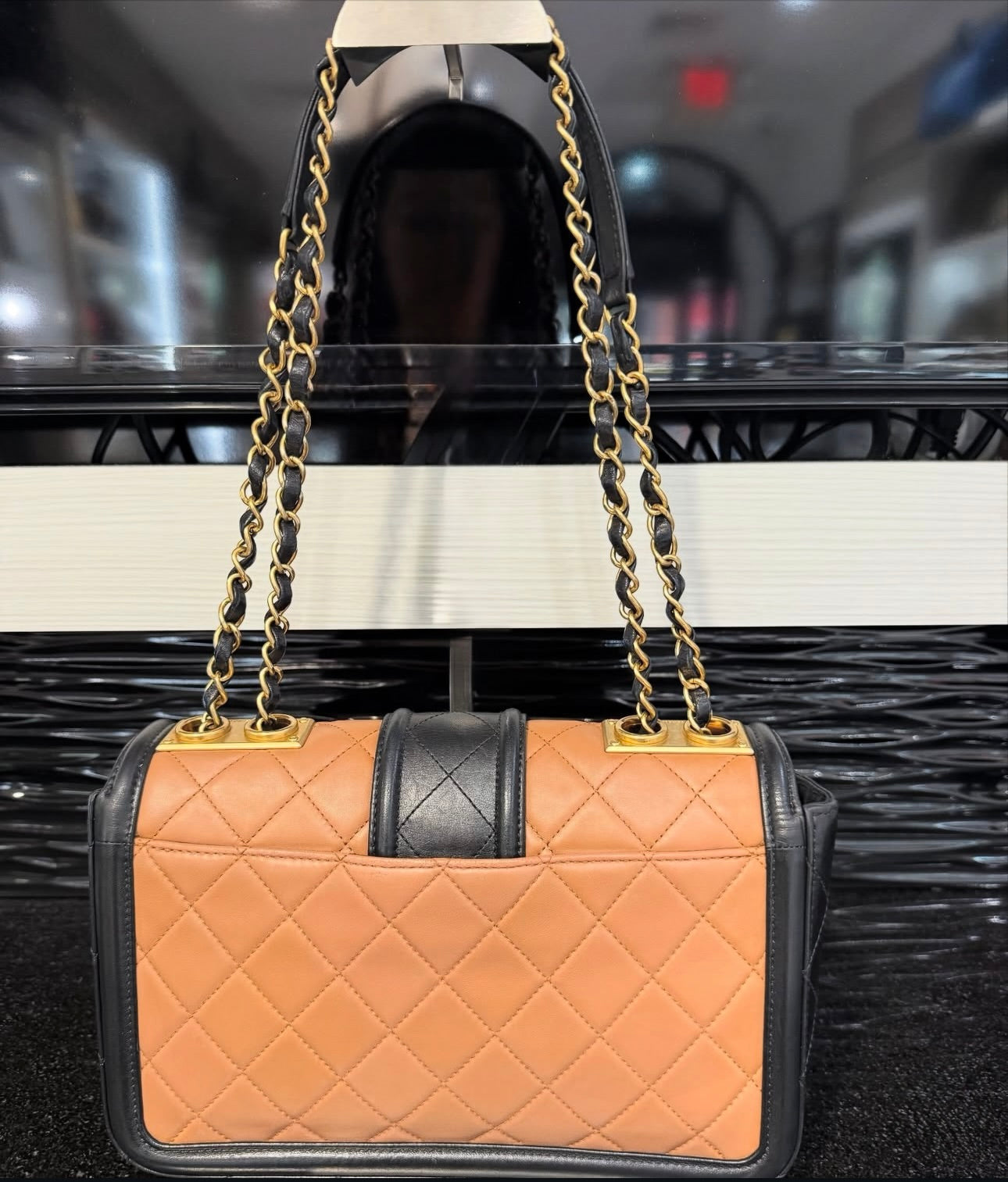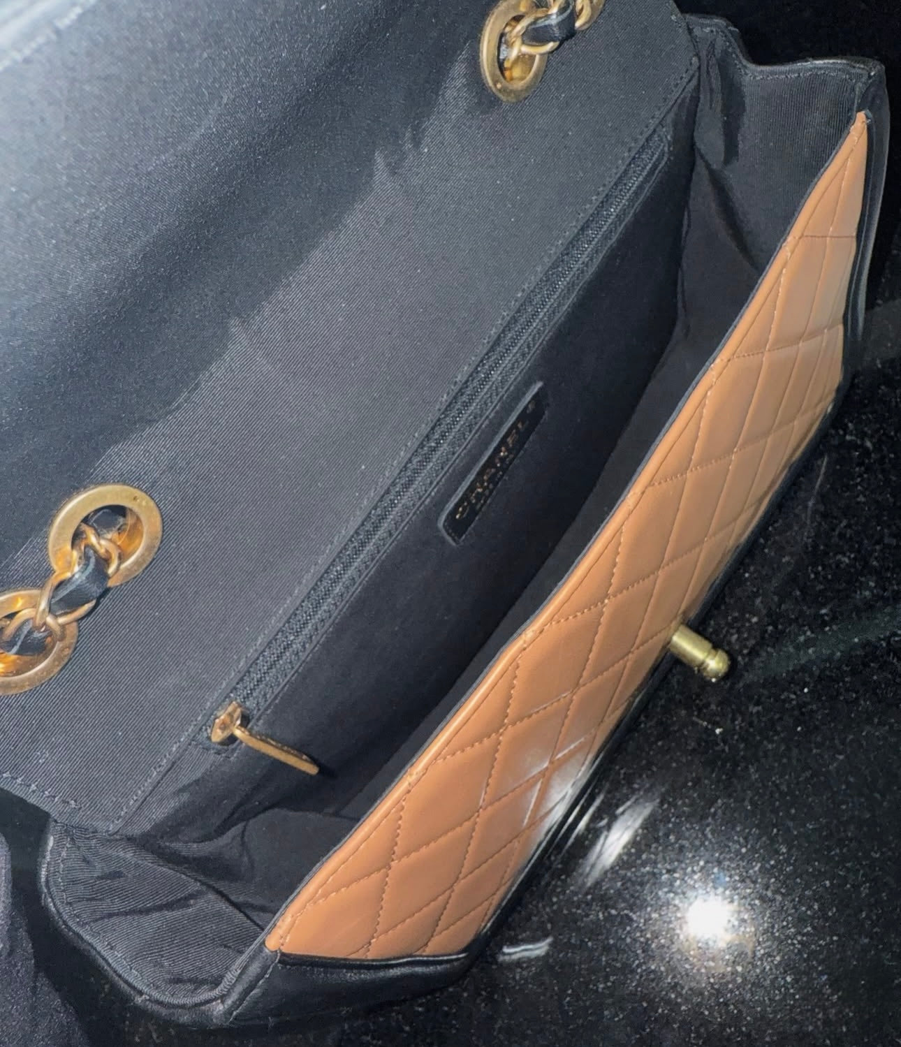 This Chanel Two-Tone Medium Flap Bag combines timeless elegance with sophisticated contrast. Crafted from quilted lambskin leather in tan with black leather accents, it’s a standout piece that seamlessly transitions between day and evening wear.