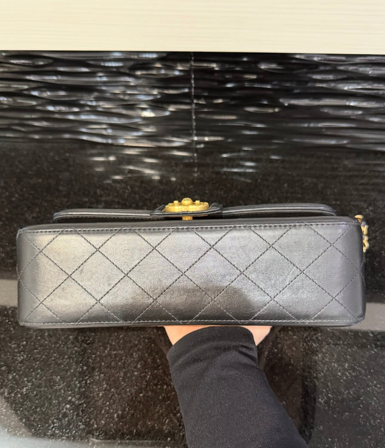 - Hardware: Features aged gold hardware, including the iconic Chanel CC press lock closure.