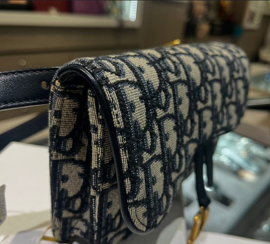 Crafted from iconic Dior Oblique jacquard in blue, it pays homage to the beloved Saddle line with its signature flap and D-stirrup magnetic clasp. This versatile accessory effortlessly combines functionality with elegance.