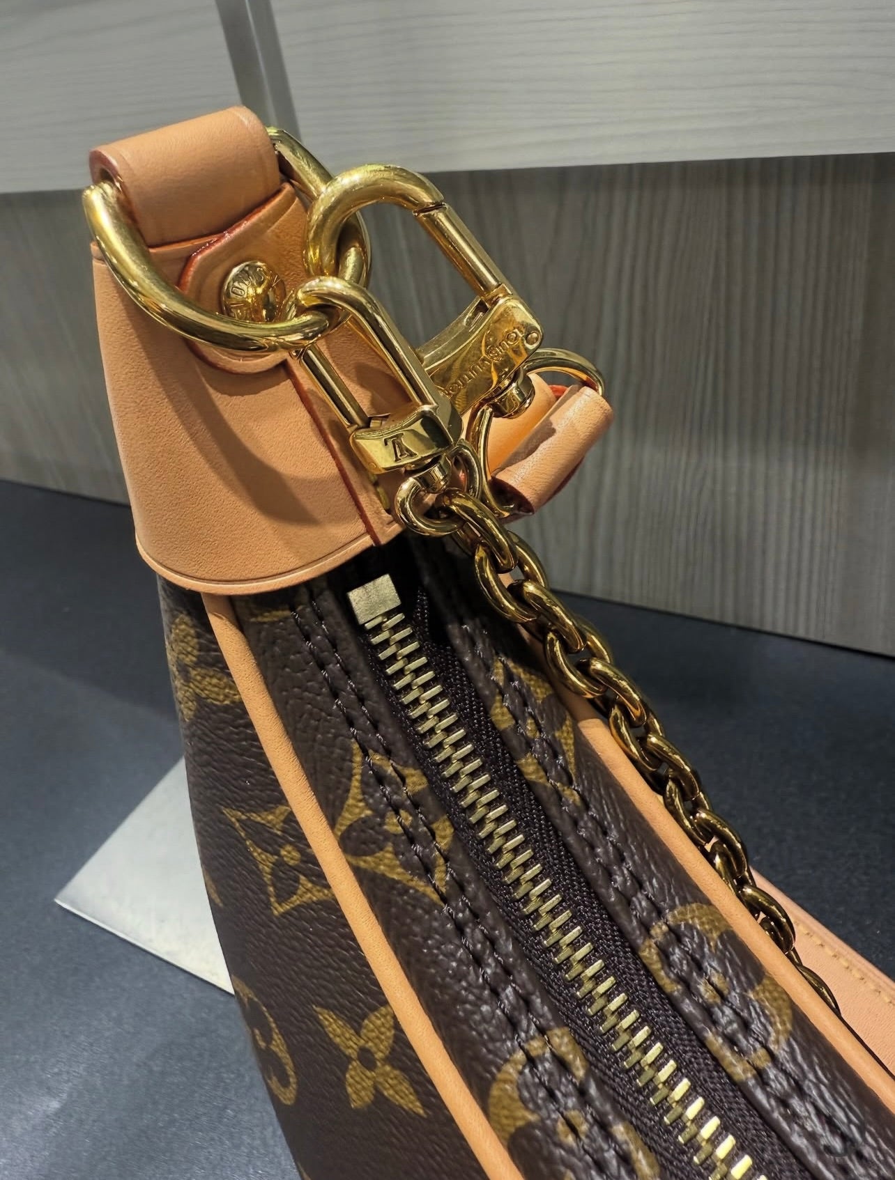 Its compact, body-friendly shape includes a removable chain-link handle for shoulder wear and a removable, adjustable leather strap for hands-free, crossbody convenience. The front zip pocket is finished with a signature LV Circle zip pull, adding an iconic touch.