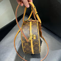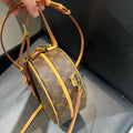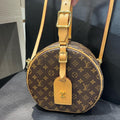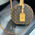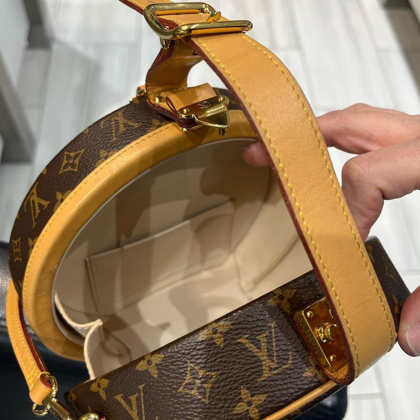 This pre-owned, like-new Louis Vuitton Petite Boite Chapeau is a stylish, versatile addition to any luxury collection. Crafted from iconic Monogram coated canvas and accented with aged natural cowhide leather trim, this bag is both timeless and elegant. The petite 6.9 x 6.5 x 3-inch size makes it a perfect day-to-night companion, offering enough space to carry essentials like a regular-sized iPhone (though an iPhone Pro Max may not fit), lip gloss, and a small wallet. Lined with smooth lambskin and featuring gold-tone metallic hardware, it also has four protective brass studs to keep it pristine when placed down.