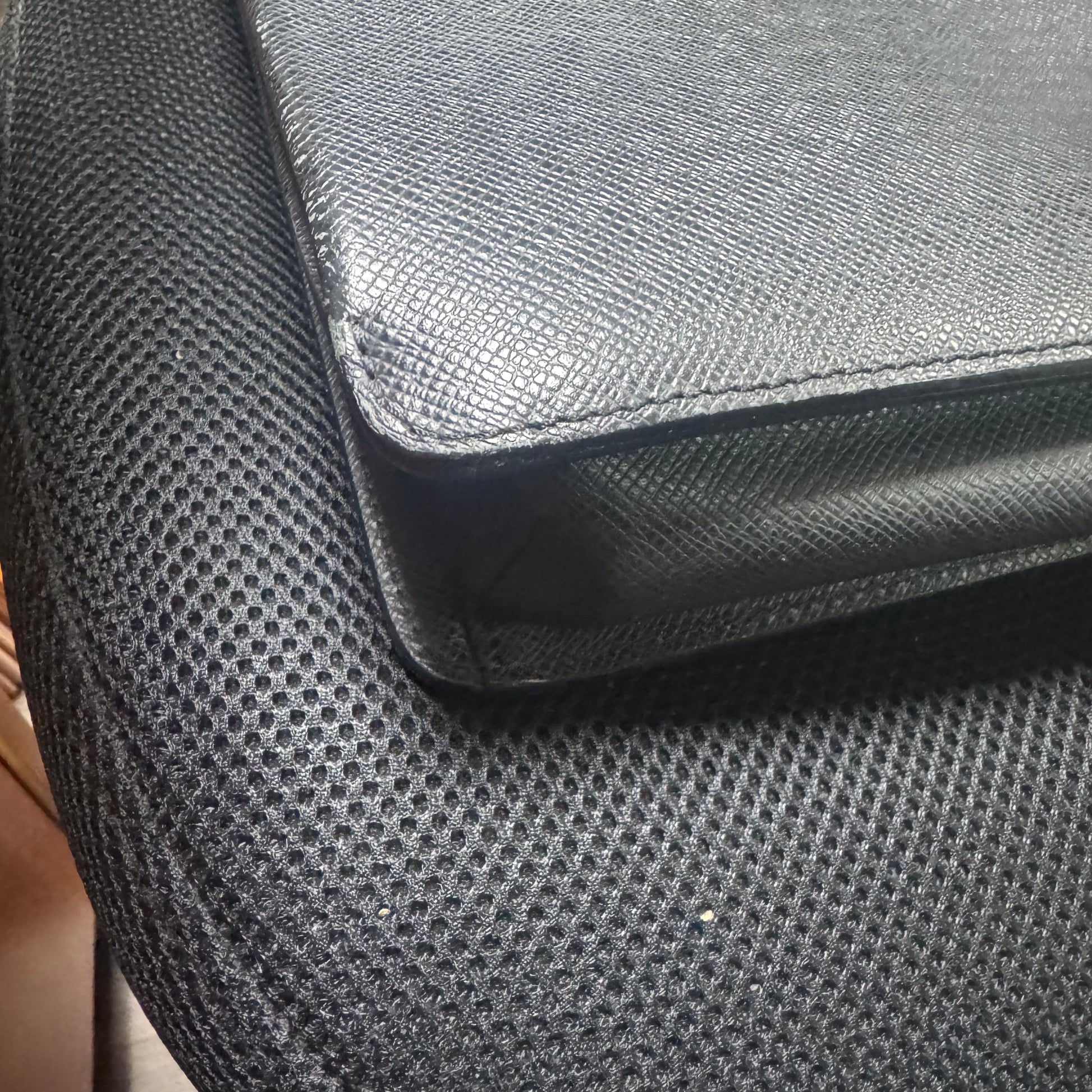 - Condition: Pre-owned, good condition with visible wear; exterior fabric and hardware show scratches, and corners have some scuffing.