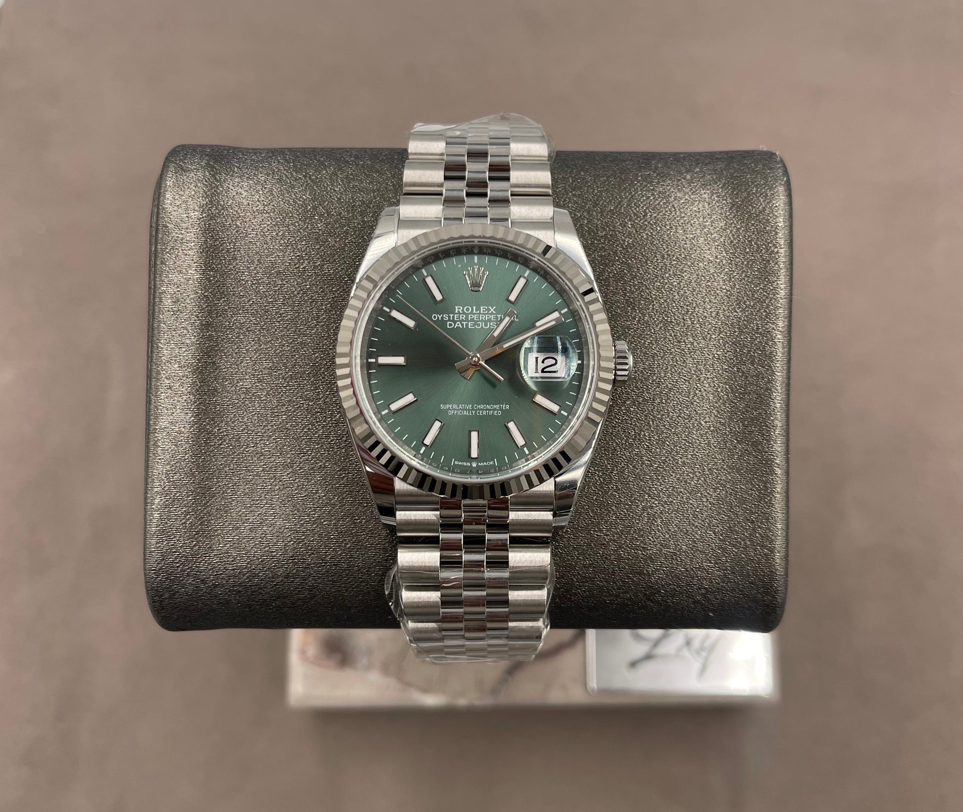 Unworn Rolex Men's Datejust 36mm ref.126234 Green Index Dial Fluted Bezel on Jubilee w/Box & Card
