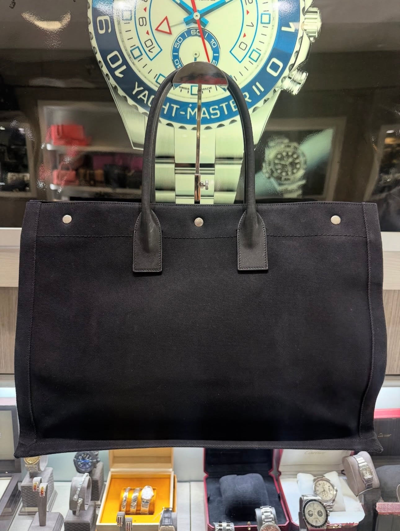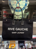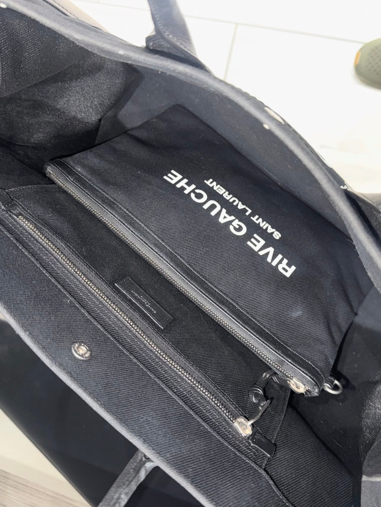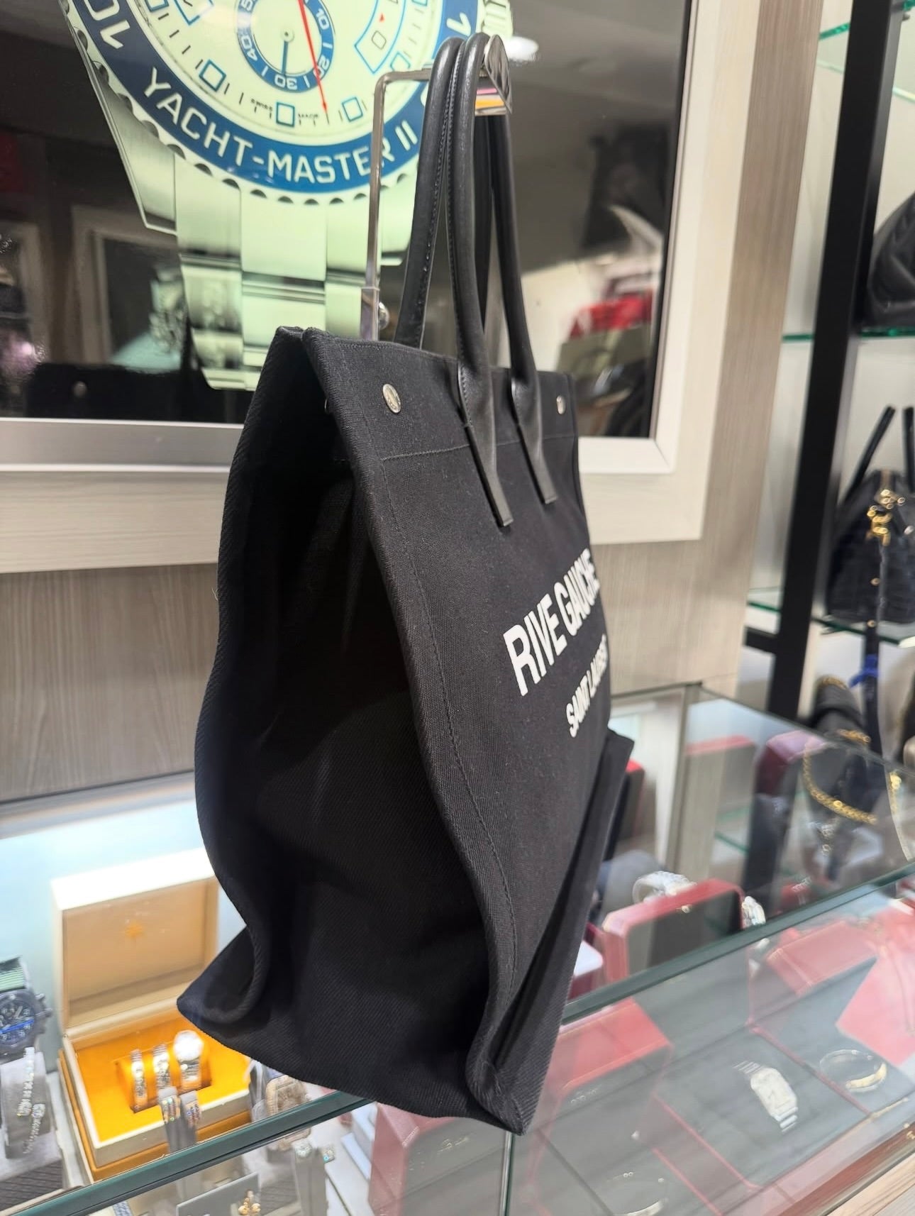 This Saint Laurent Rive Gauche Tote and Pouch Set offers timeless Parisian style and versatility. Crafted from durable black canvas with leather trim, both pieces feature the signature “Rive Gauche Saint Laurent” logo for a bold, modern finish.