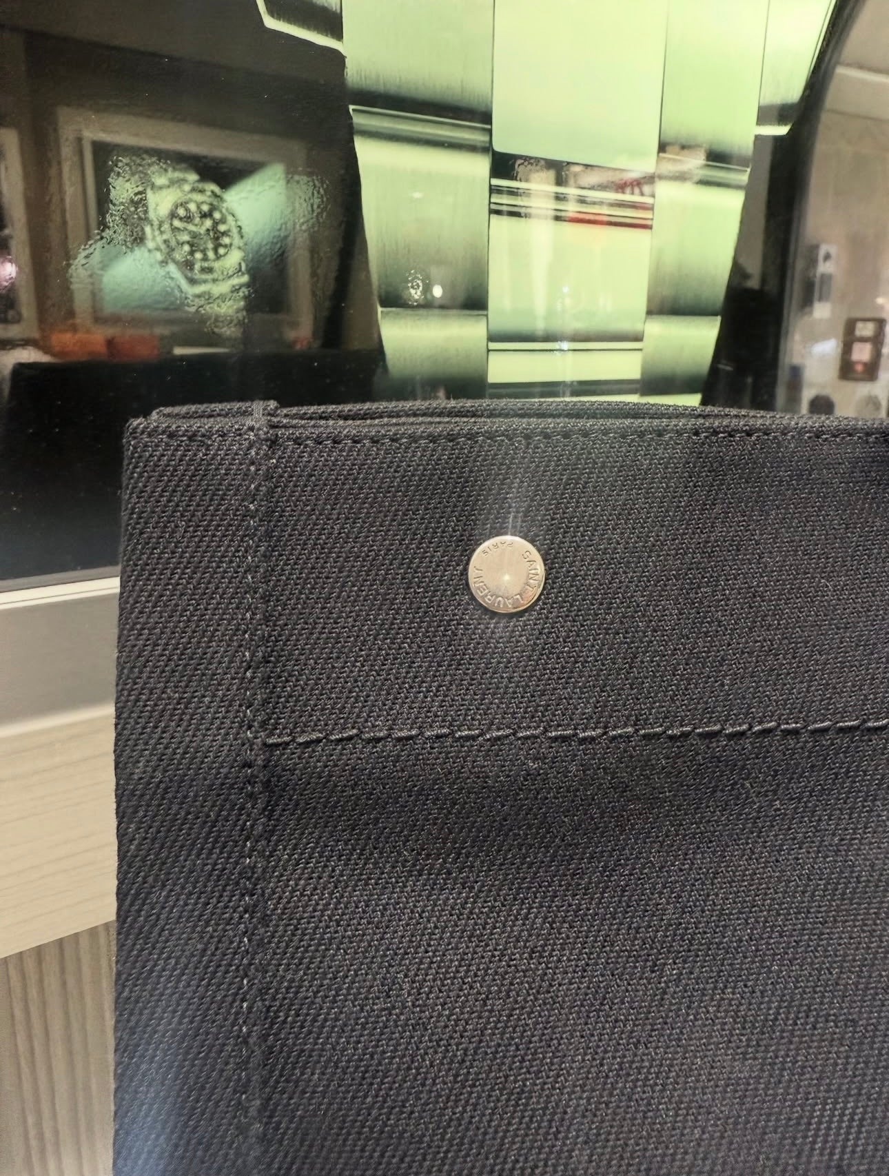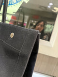 The tote bag showcases a relaxed structure with rolled leather handles (6.7” drop), three brass snap closures, and a spacious interior with a zip pocket—ideal for everyday essentials. The pouch, designed in matching canvas with silver-tone hardware and leather trim, features a zip closure and grosgrain lining with a single interior pocket. While the pouch is missing its wrist strap, this can be easily replaced for full functionality.