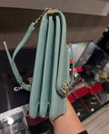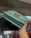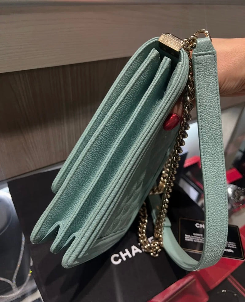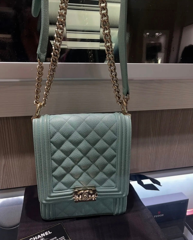 - Material: Durable caviar leather in light blue with diamond quilting and a linear quilted border.