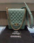 Add a touch of elegance to your wardrobe with this Chanel Caviar Quilted North-South Boy Flap Bag in a dreamy light blue hue. From the 2020 Collection by Virginie Viard, this piece offers a sophisticated vertical silhouette paired with Chanel's signature craftsmanship.