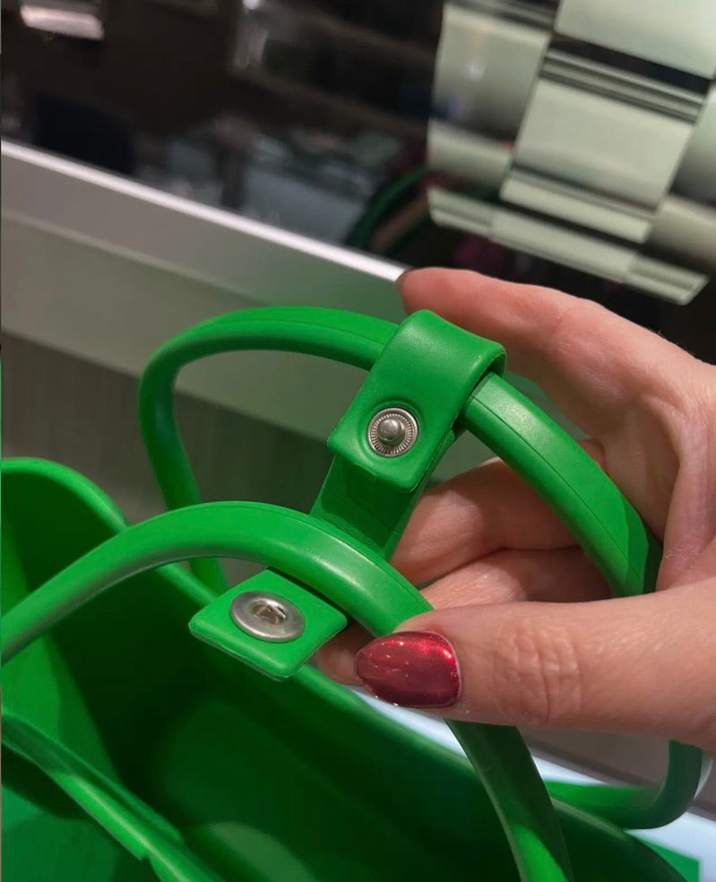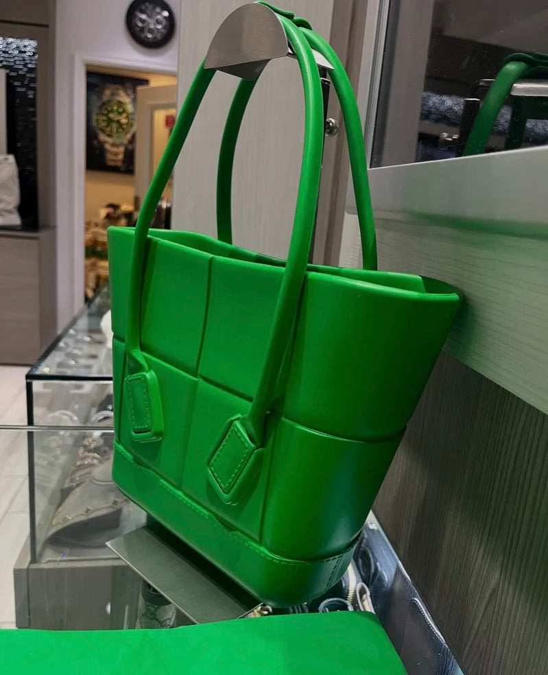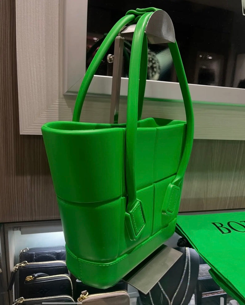 This Bottega Veneta Arco Small Tote Bag is a playful yet sophisticated take on the brand’s iconic Intrecciato weave, reimagined in bold green embossed rubber. Designed to be both durable and stylish, this Italian-made tote features a compact silhouette and signature arched tubular straps, perfect for everyday use or a statement accessory.