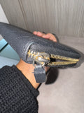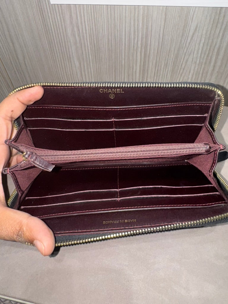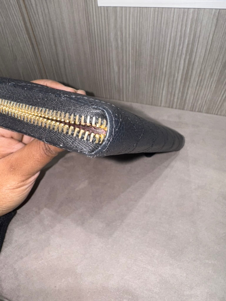 Condition: Very Good – The wallet shows light scuffing on the exterior corners and minimal discoloration on the interior. There is light creasing from normal use, and the metal parts have minimal scratches, consistent with the wallet’s age. The zipper tape shows some pilling, and there is fraying and peeling at the wax edges of the zipper pull. However, these signs of wear are minimal and do not detract from the overall luxurious feel and functionality of the wallet.