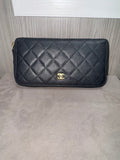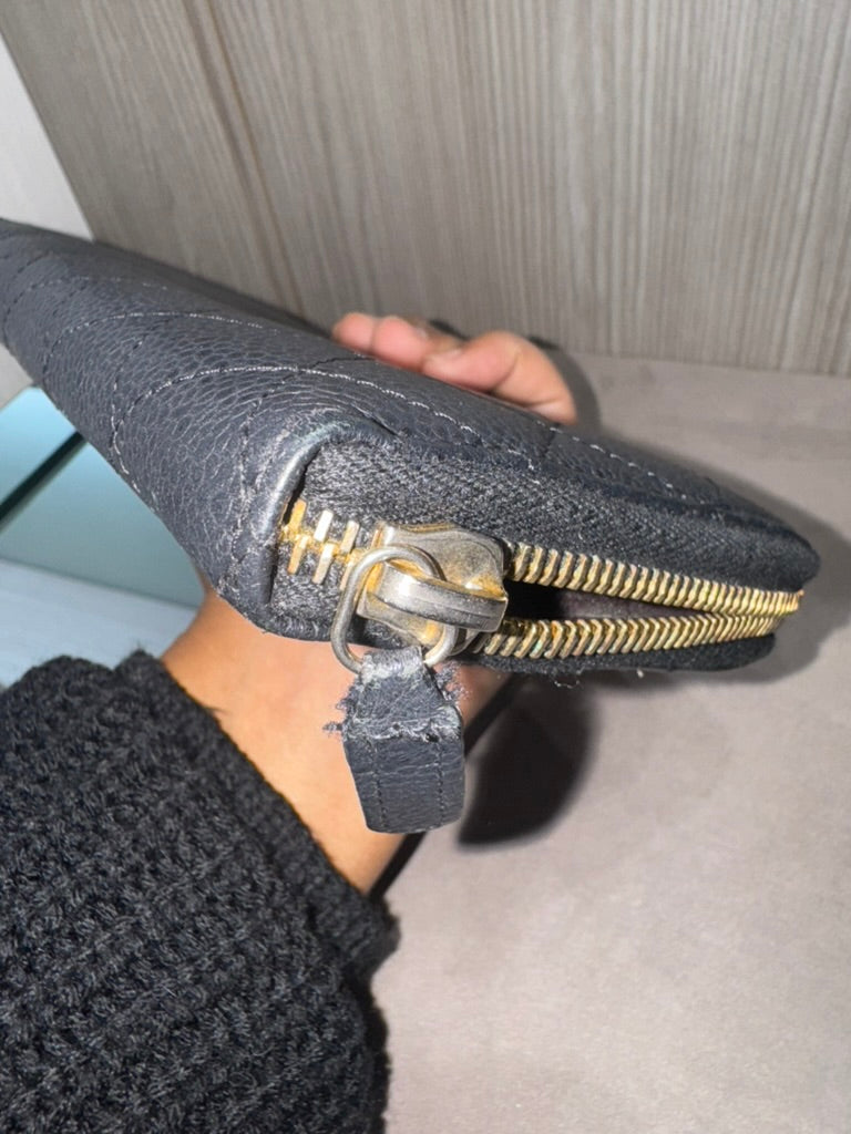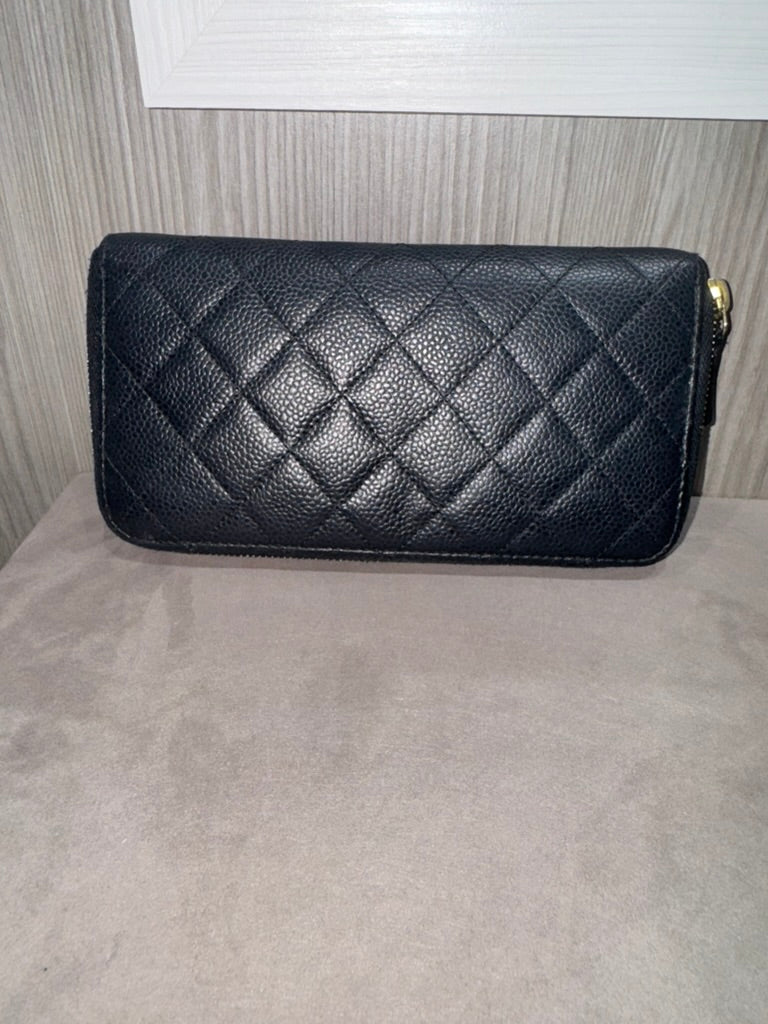 Add a touch of timeless luxury to your collection with this Pre-owned Chanel Black Zip Around Wallet from the 2012 Matelassé Coco Mark series. Crafted from black caviar leather, renowned for its durability and luxurious texture, this wallet combines elegance with functionality. The diamond quilting and signature interlocking CC logo on the front are iconic design elements that make this wallet a must-have for any Chanel enthusiast.
