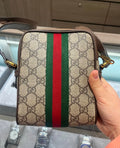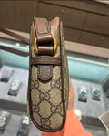 A timeless blend of classic design and practicality, the Gucci GG Ophidia Shoulder Bag showcases the house's signature elements in a sleek and compact silhouette. Crafted from durable beige/ebony GG Supreme canvas, this shoulder bag is accented with the iconic green and red Web stripe and antique gold-toned Double G hardware, making it a versatile piece for everyday wear.