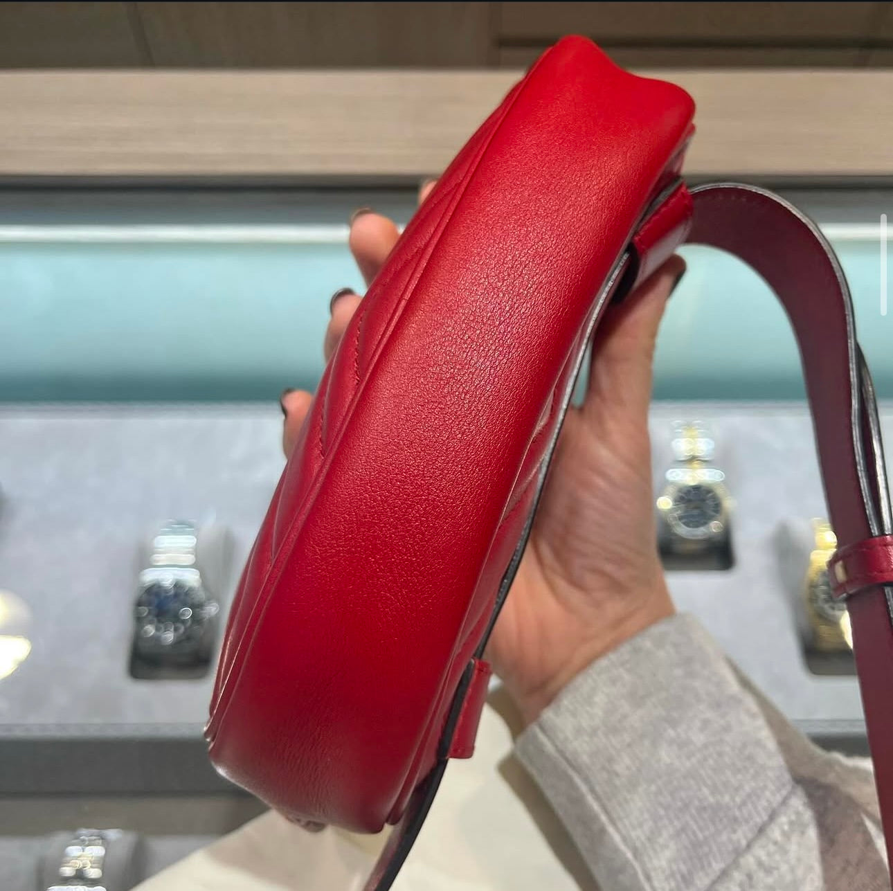 - Material: Red matelassé quilted leather with a soft texture and luxurious finish.