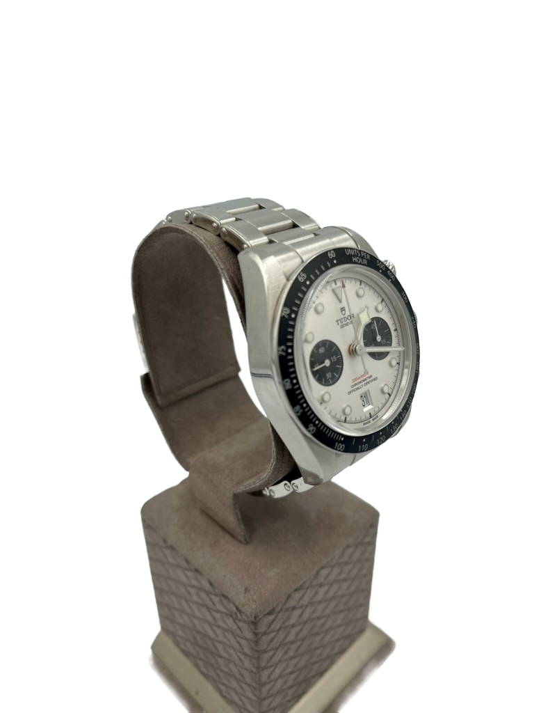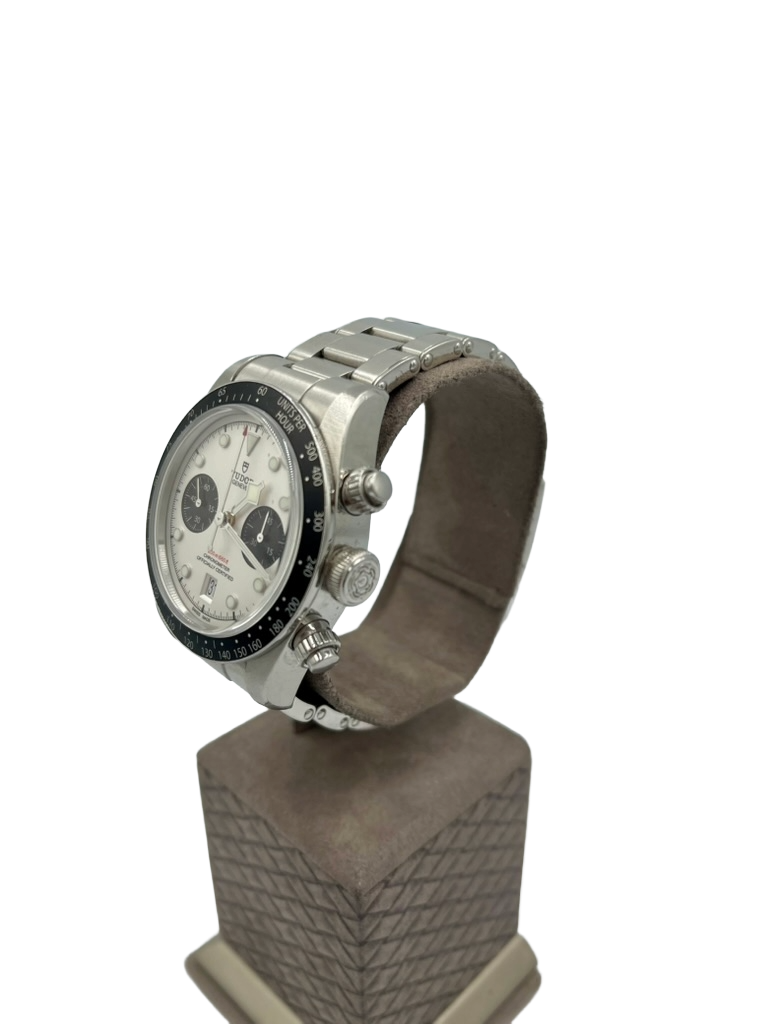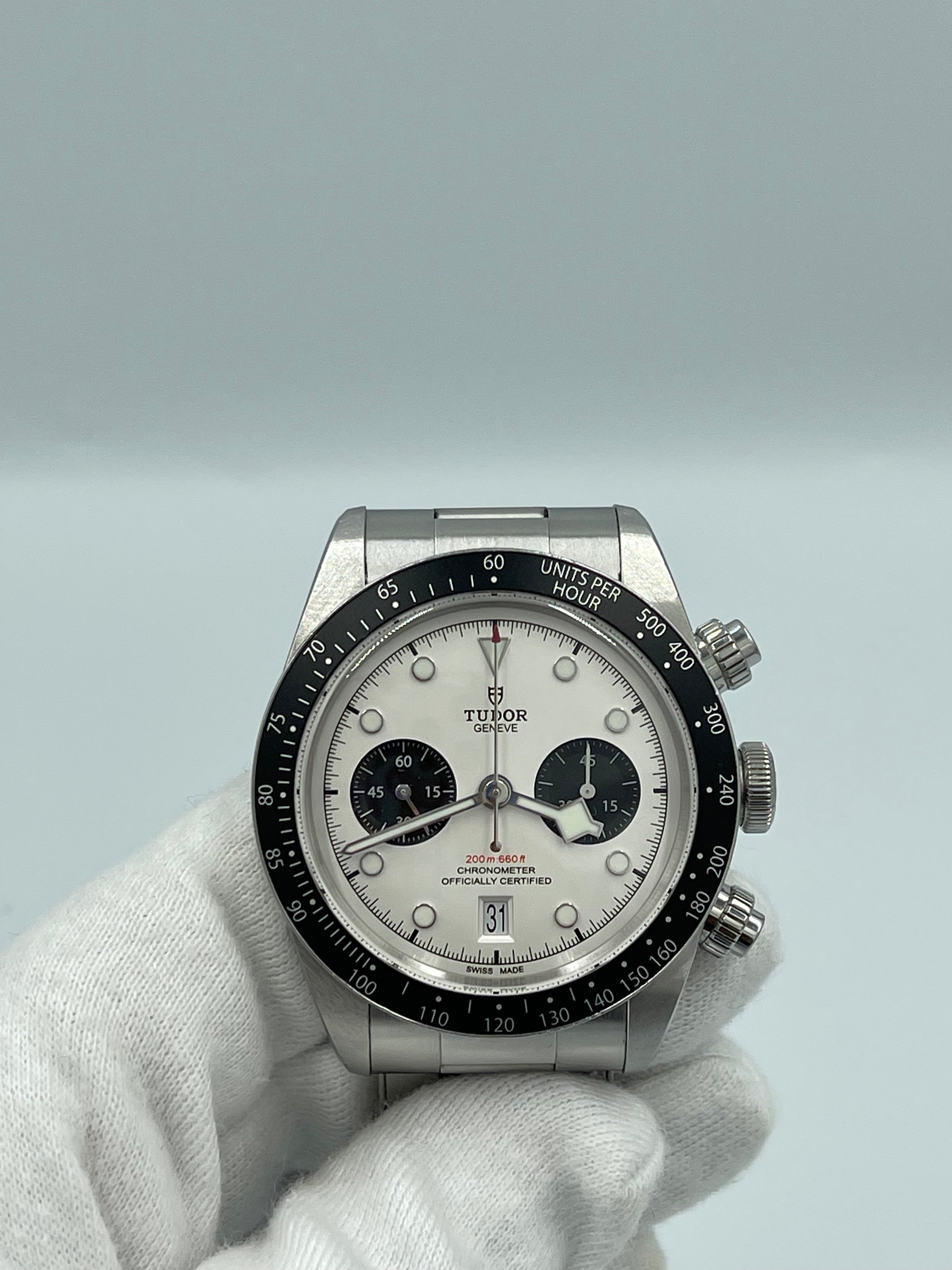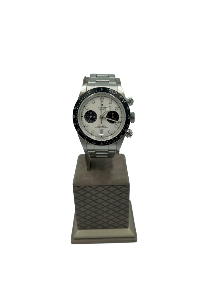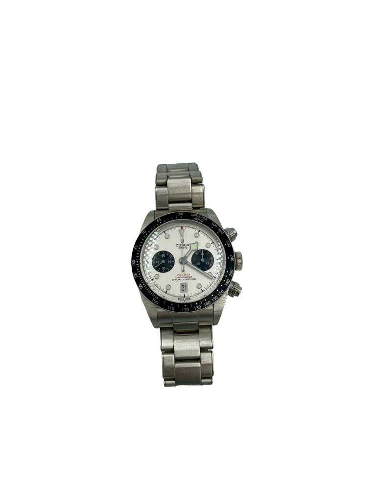 This authentic Tudor Black Bay Chrono Panda Ref. 79360 seamlessly merges the heritage of Tudor’s diving roots with the spirit of motorsport-inspired chronographs. Crafted in stainless steel, this bold and versatile timepiece features a 41mm case, a striking white dial with black sub-dials, and a fixed black aluminum tachymeter bezel, giving it an iconic and sporty presence on the wrist.