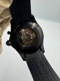 Black PVD titanium grade 5 case with a black rubber strap. Fixed black PVD titanium grade 5 bezel. Blue skeleton dial with silver-tone leaf-style hands and dot hour markers. Minute markers around the outer rim. Dial Type: Analog. Date display at the 3 o'clock position. Chronograph - two sub-dials displaying: 60 second and 30 minute. Corum calibre CO 961 automatic movement, containing 28 Jewels, bitting at 28800 vph, and has a power reserve of approximately 42 hours. Scratch resistant sapphire crystal. Pull / push crown. Transparent case back. Round case shape. Case size: 52 mm. Case thickness: 20.2 mm. Band width: 26 mm. Tang clasp. Water resistant at 100 meters / 330 feet. Functions: chronograph, monopoussoir, date, hour, minute, second, chronometer. Big Bubble Series. Luxury watch style. Watch label: Swiss Made. Item Variations: L961/03309. Corum Big Bubble Chronograph Automatic Chronometer Men's Watch 961.201.95/0371 CT01.