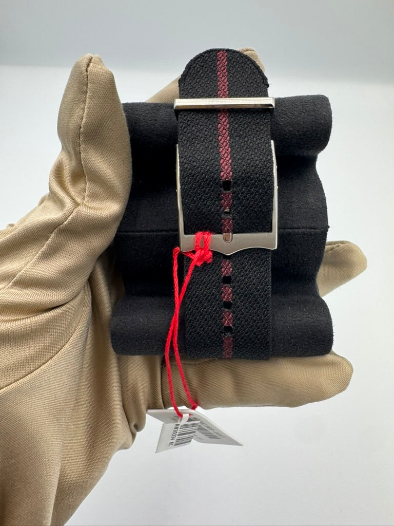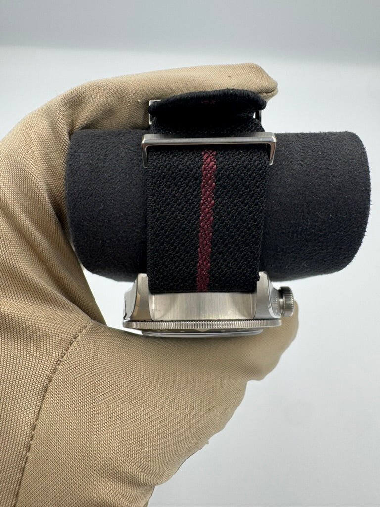 Black fabric strap with burgundy band and buckle |