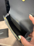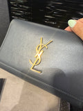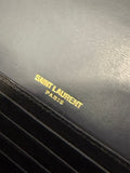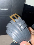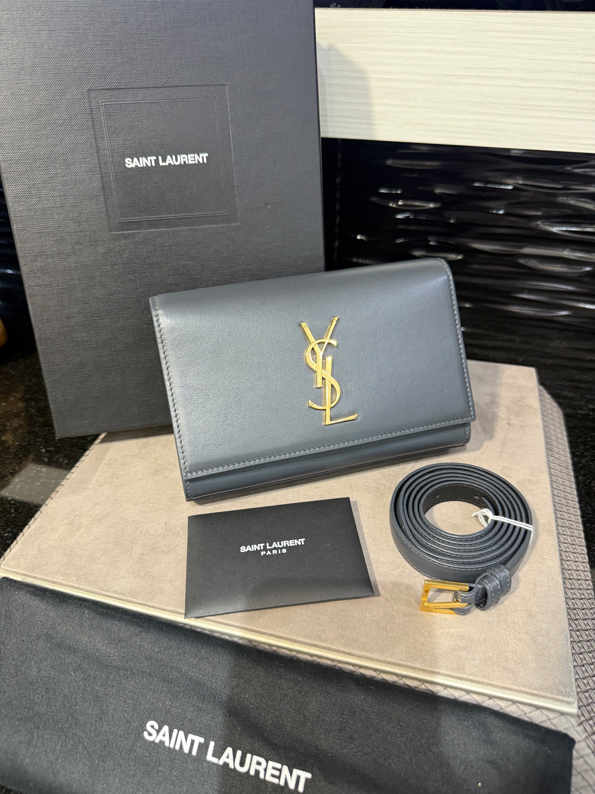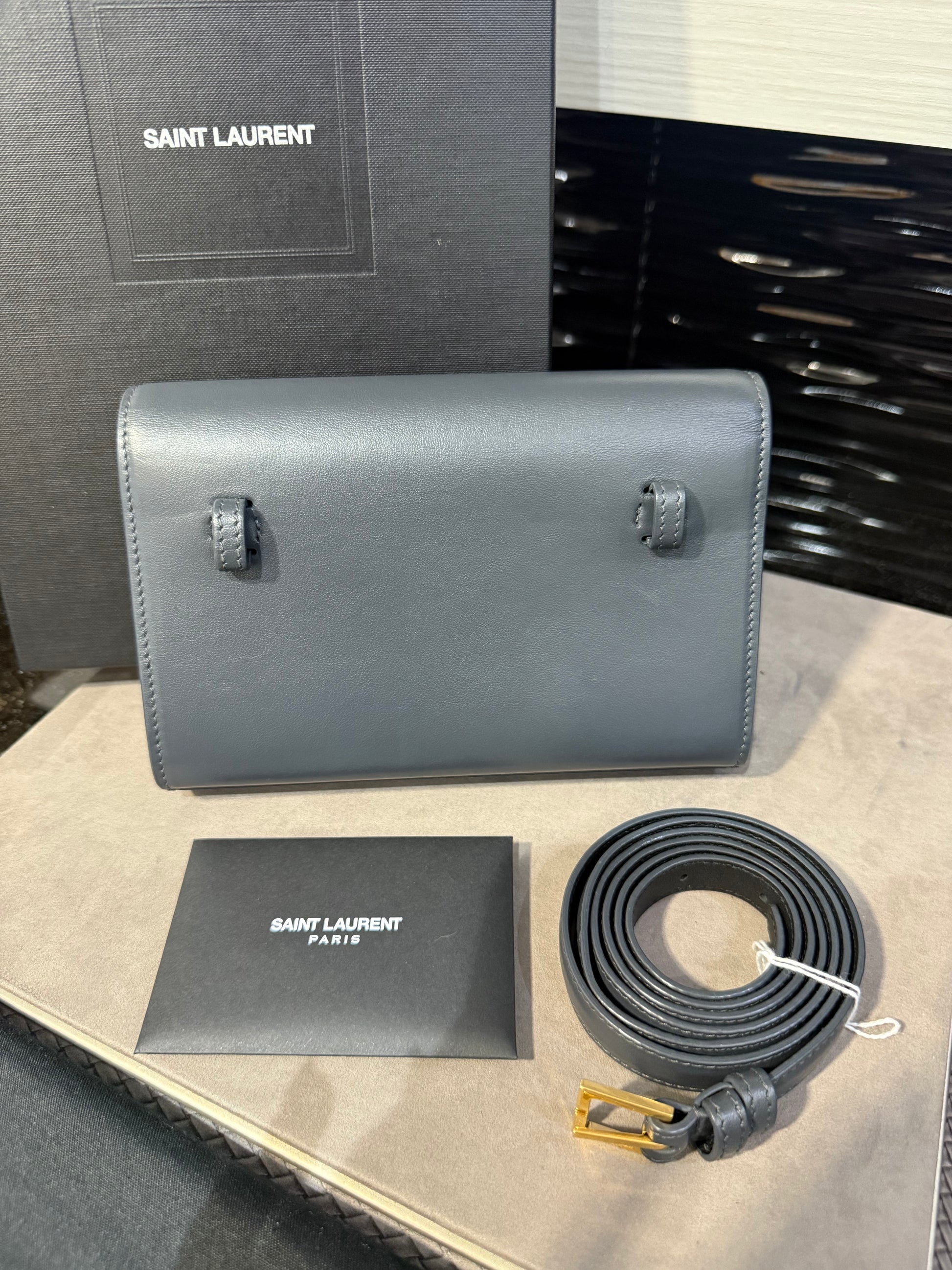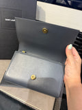 This authentic Saint Laurent Kate Belt Bag in smoke grey grain de poudre-embossed calfskin leather blends hands-free practicality with iconic Parisian style. Featuring the brand’s signature gold-toned metal Cassandre logo on the flap, this versatile design can be worn around the waist or across the body, thanks to its adjustable strap (65–110 cm). The detachable pouch offers flexibility, allowing it to be styled as a clutch.
