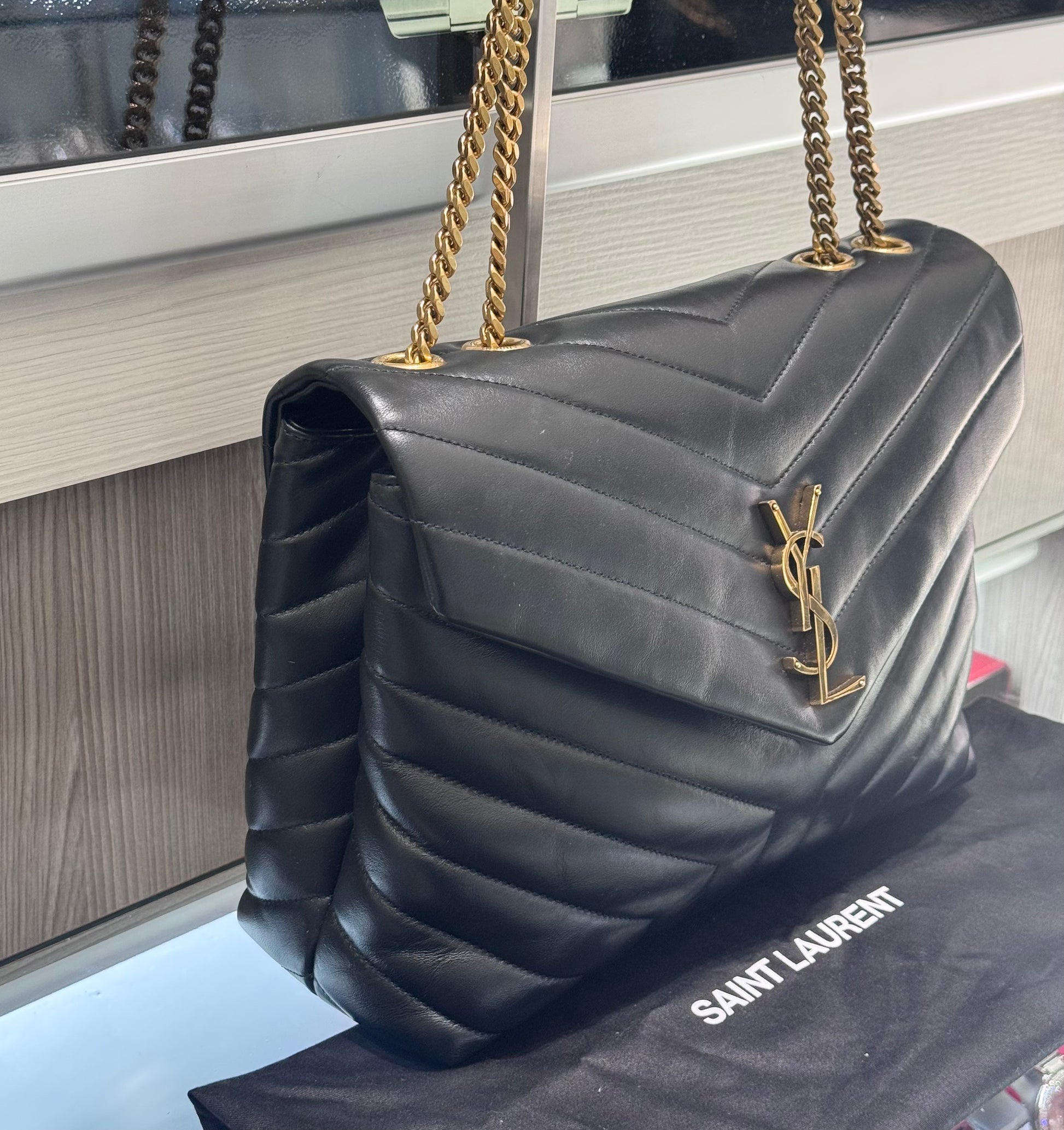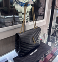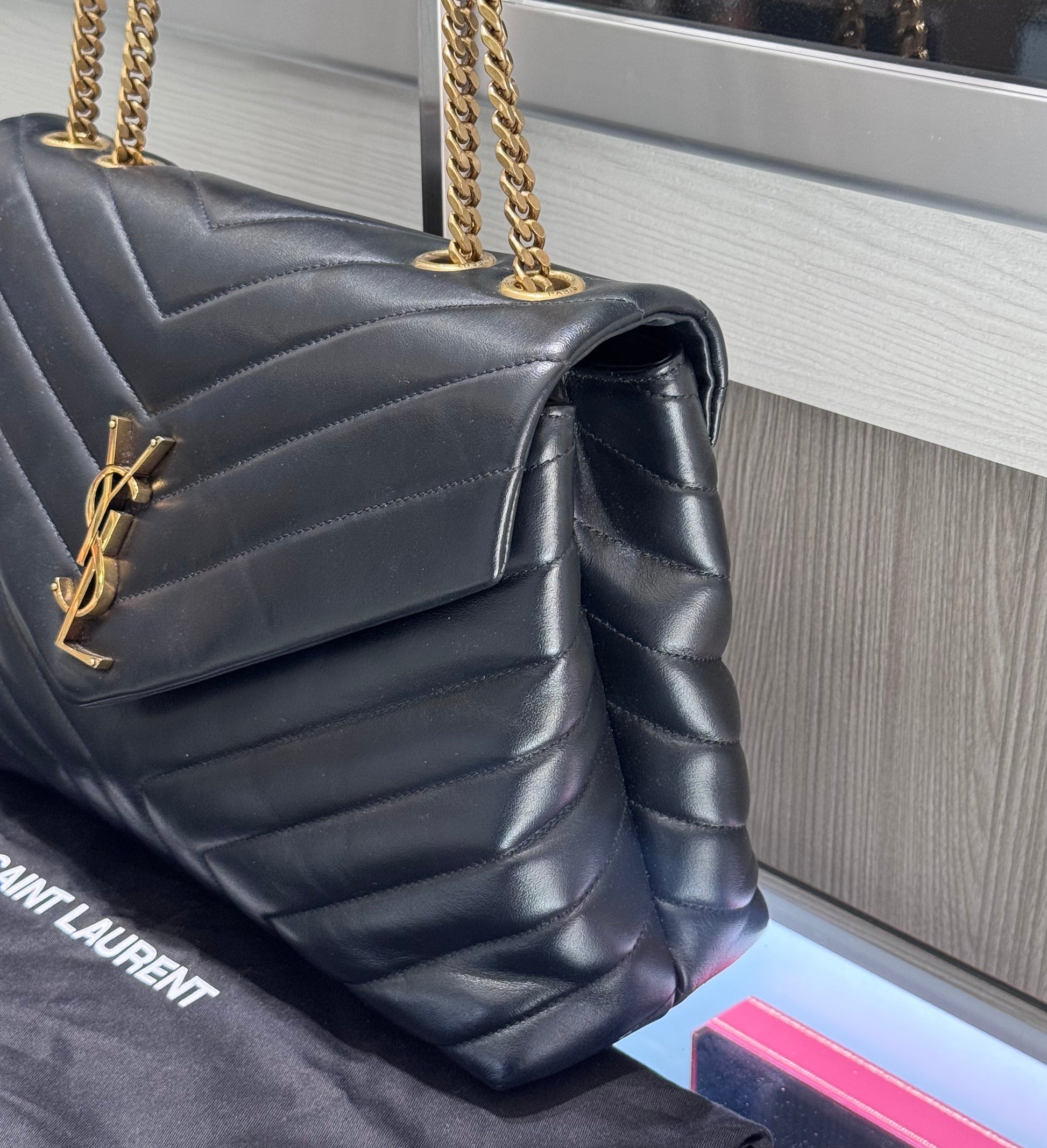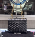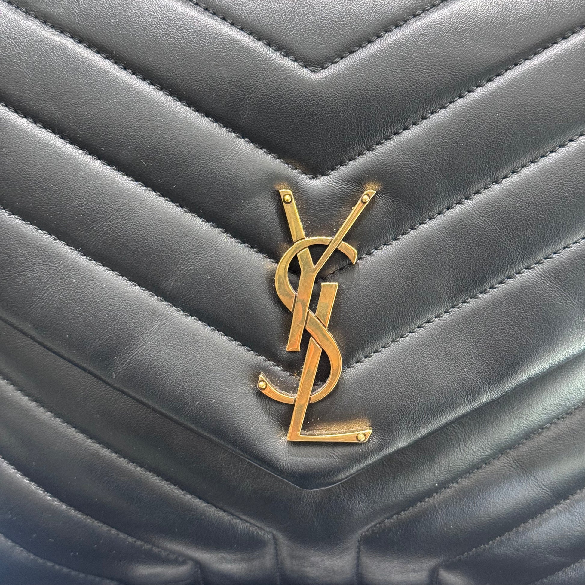 This elegant Medium Loulou bag is crafted from beautifully quilted black leather featuring the signature chevron Y pattern and finished with aged gold-tone hardware. A timeless and versatile design, it features chain-link shoulder straps with leather shoulder pads for comfortable wear and the iconic YSL monogram on the front flap.