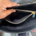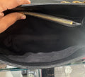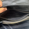 The envelope-style flap with snap closure opens to a partitioned grosgrain-lined interior with zip pockets, offering organized space for everyday essentials.