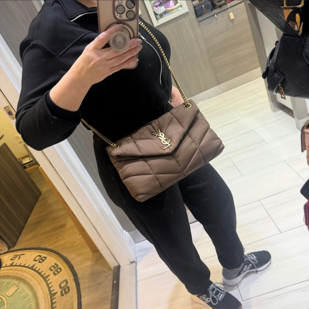 Soft, structured, and effortlessly chic, this Saint Laurent Small Puffer Bag in Tetra Brown nylon captures the modern elegance of the House’s iconic Puffer line. From the 2023 collection, this piece pairs a plush, quilted silhouette with antique gold-tone hardware and luxurious leather trim, making it the perfect mix of comfort and sophistication.